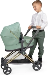 Este cochecito para muñecas de estilo moderno destaca por la combinación de tejido verde menta y detalles decorativos, incluidos elementos dorados. Gracias a su diseño inteligente, se transforma con facilidad de capazo profundo a versión deportiva y viceversa. El manillar alto (73 cm) garantiza un manejo cómodo incluso para niños en edad preescolar.