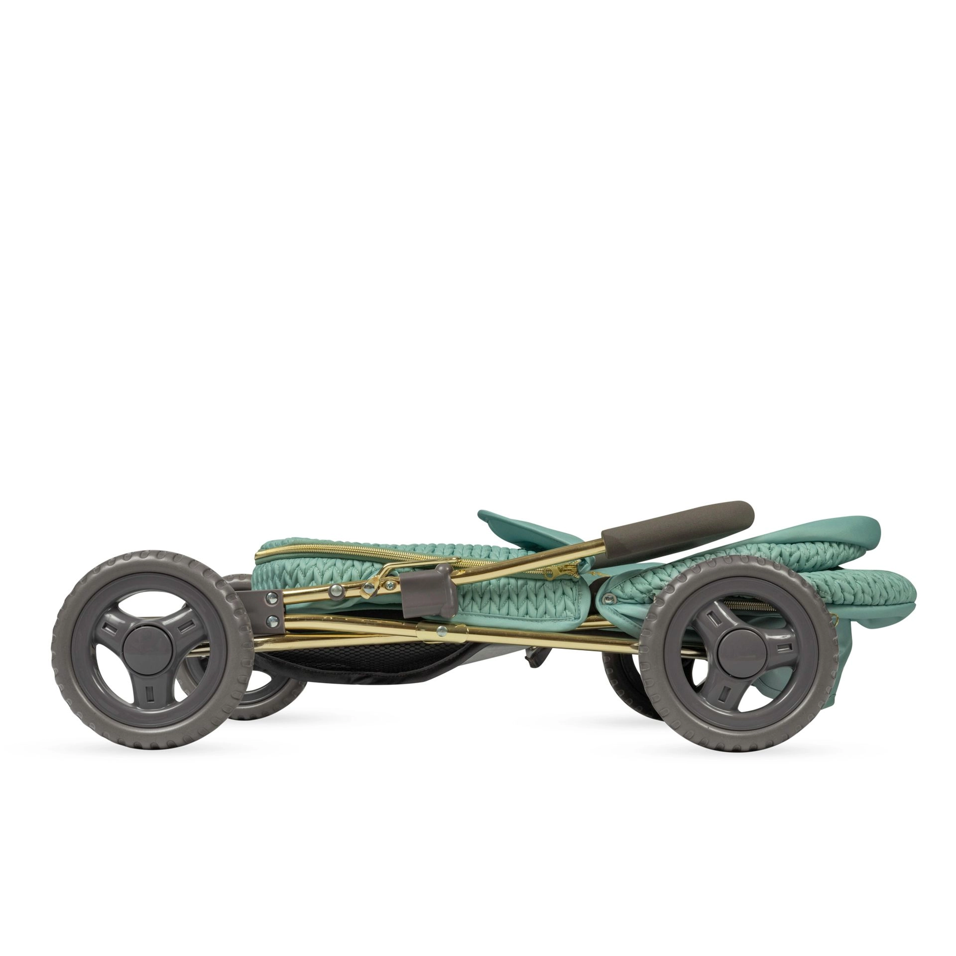 Descubre el cochecito infantil para muñecas de la colección Capriccio 2025 con su inconfundible color verde menta y elegantes detalles dorados. La combinación de tejido efecto punto e hilado liso aporta un aspecto lujoso, mientras que el bastidor ligero y el manillar más bajo garantizan un manejo cómodo incluso para los más pequeños.