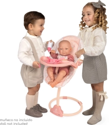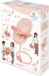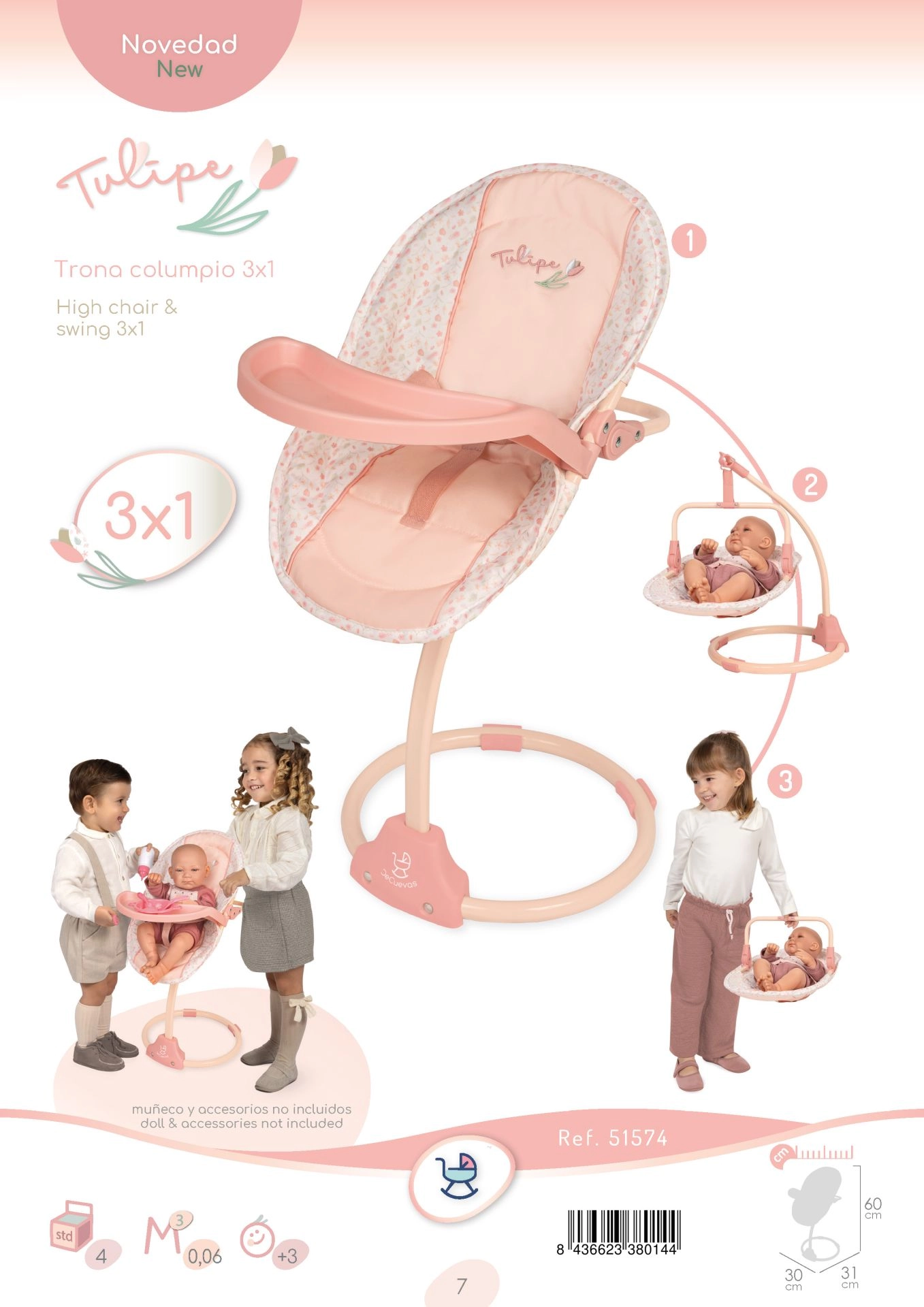 La elegante trona y columpio 3 en 1 de la colección Tulipe encanta por su diseño delicado y su funcionalidad inteligente. Gracias al asiento extraíble y reversible, puede usarse como trona, columpio y portabebés. Incluye arneses de seguridad, bandeja de plástico para la comida y una estructura ligera pero estable para una manipulación sencilla. Ideal para muñecas de hasta 50 cm y para niños a partir de 3 años.