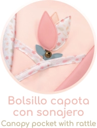 Los detalles prácticos encantan en el juego diario: ruedas delanteras giratorias para un paseo fluido, cesta de almacenamiento para pequeños objetos, bolsillo en la capota con tulipán textil y cascabel, y cubre-capazo decorativo con cierres de velcro y bolsillito. El cochecito es plegable, por lo que ocupa poco espacio y se transporta fácilmente en coche.