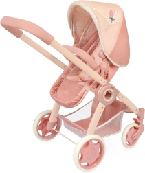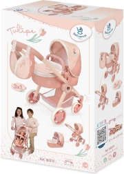 Elegante cochecito infantil para muñecas de la colección Tulipe con uso 3 en 1: capazo profundo, versión deportiva y bolsa de transporte. Gracias a las ruedas delanteras giratorias, la manija ajustable de 70 cm y la estructura plegable, el cochecito es fácil de manejar y práctico para viajar. El diseño con estilo en cálidos tonos pastel con estampado floral se complementa con un bolso extraíble en forma de tulipán y detalles pensados para un juego cómodo.