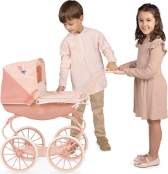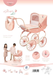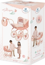 El cochecito profundo para muñecas de la colección Tulipe 2025 destaca por su elaboración precisa y la hermosa combinación de pasteles salmón claros y oscuros con un delicado motivo floral. Gracias a los muelles para balanceo y al colchón suave, ofrecerá a la muñeca un cómodo “sueño”, mientras que la capota plegable y la cubierta del capazo la protegen durante los paseos.