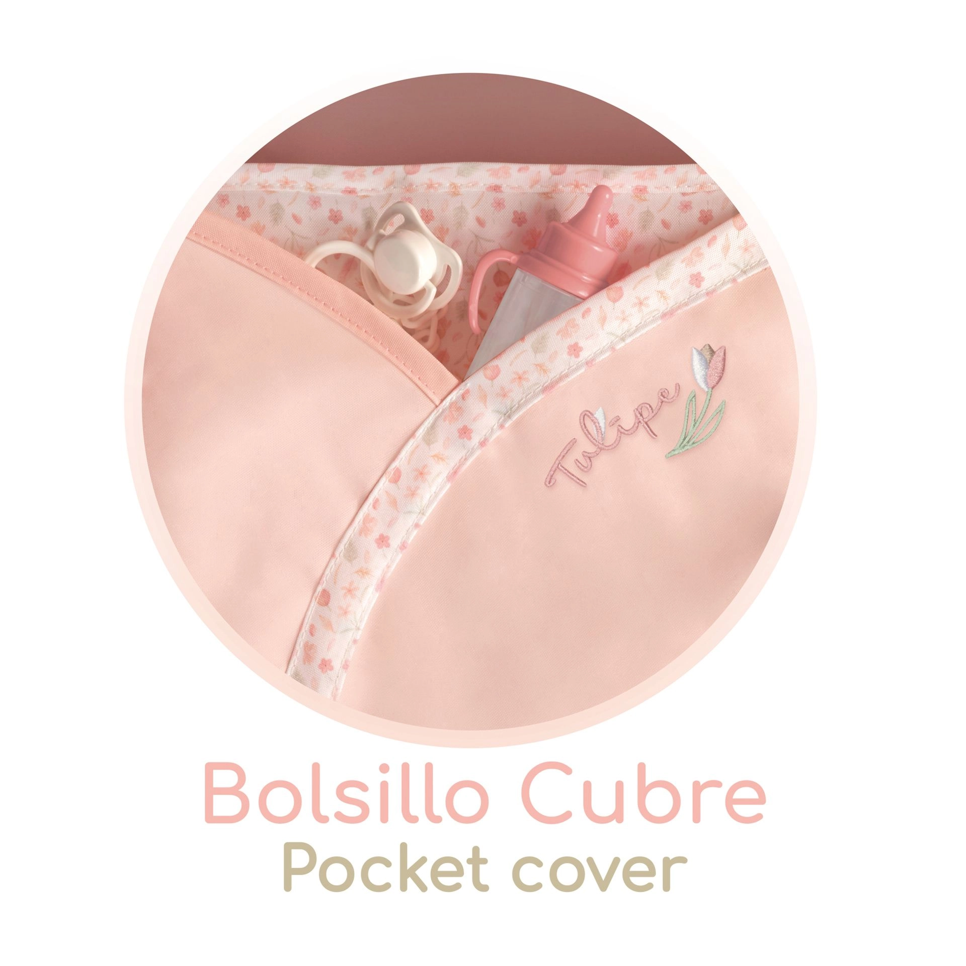 Los cálidos colores pastel con un delicado estampado floral y el icónico bolso con forma de tulipán convierten al cochecito en una pieza imposible de pasar por alto.
