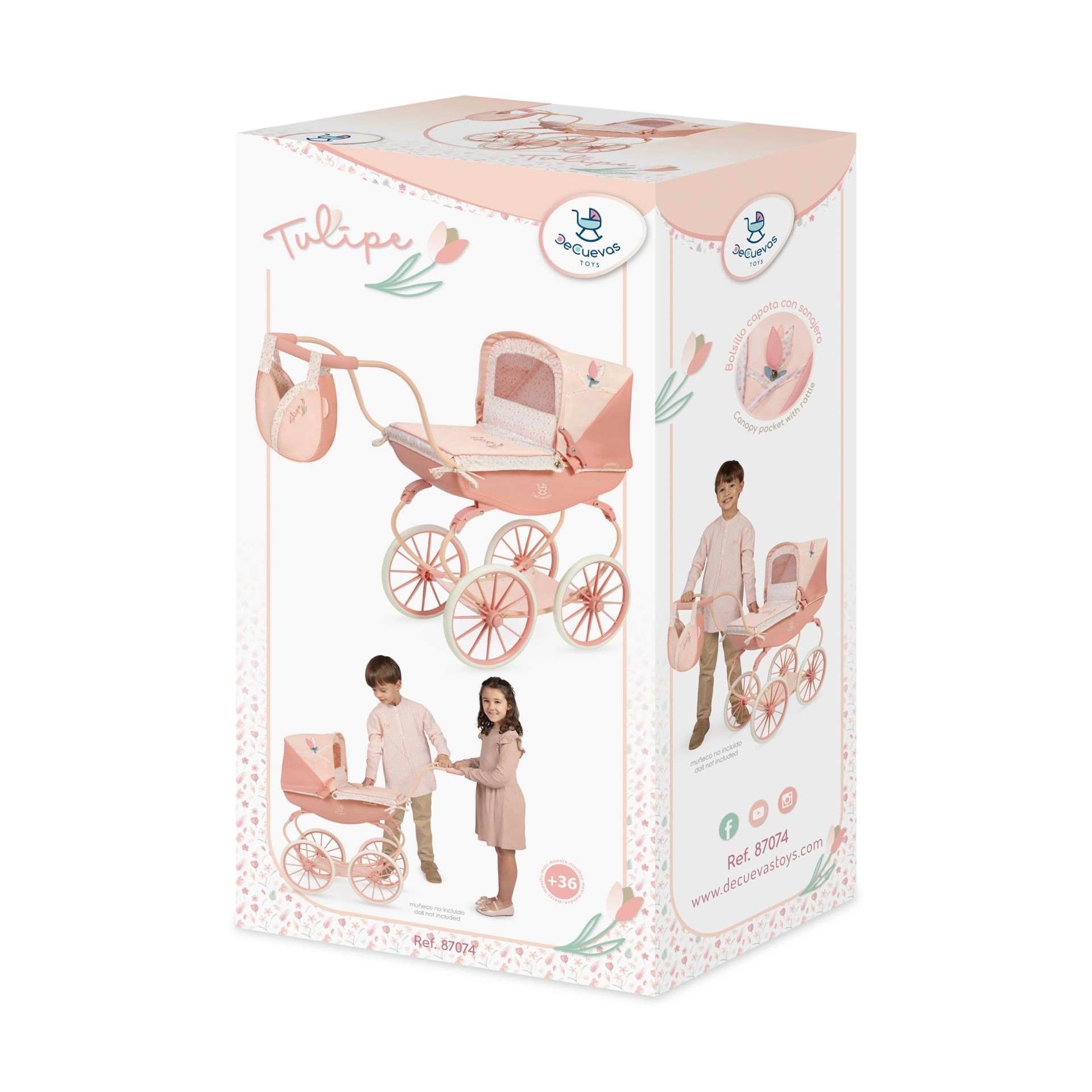 El elegante cochecito para muñecas DeCuevas Tulipe con altura al manillar de 68 cm destaca por su precioso diseño español en cálidos tonos pastel. Ofrece capota plegable, balanceo con muelles, bolso extraíble con forma de tulipán y práctico espacio de almacenamiento para accesorios. Ideal para niños a partir de 3 años y para amantes de los accesorios con estilo para la habitación infantil.