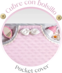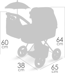 Incluye un práctico parasol, un bolso desmontable y una cubierta para el capazo con ojales para una sujeción firme. El colchón suave y el capazo espacioso ofrecen comodidad a la muñeca, mientras que la cesta inferior proporciona espacio para pequeños objetos y accesorios.