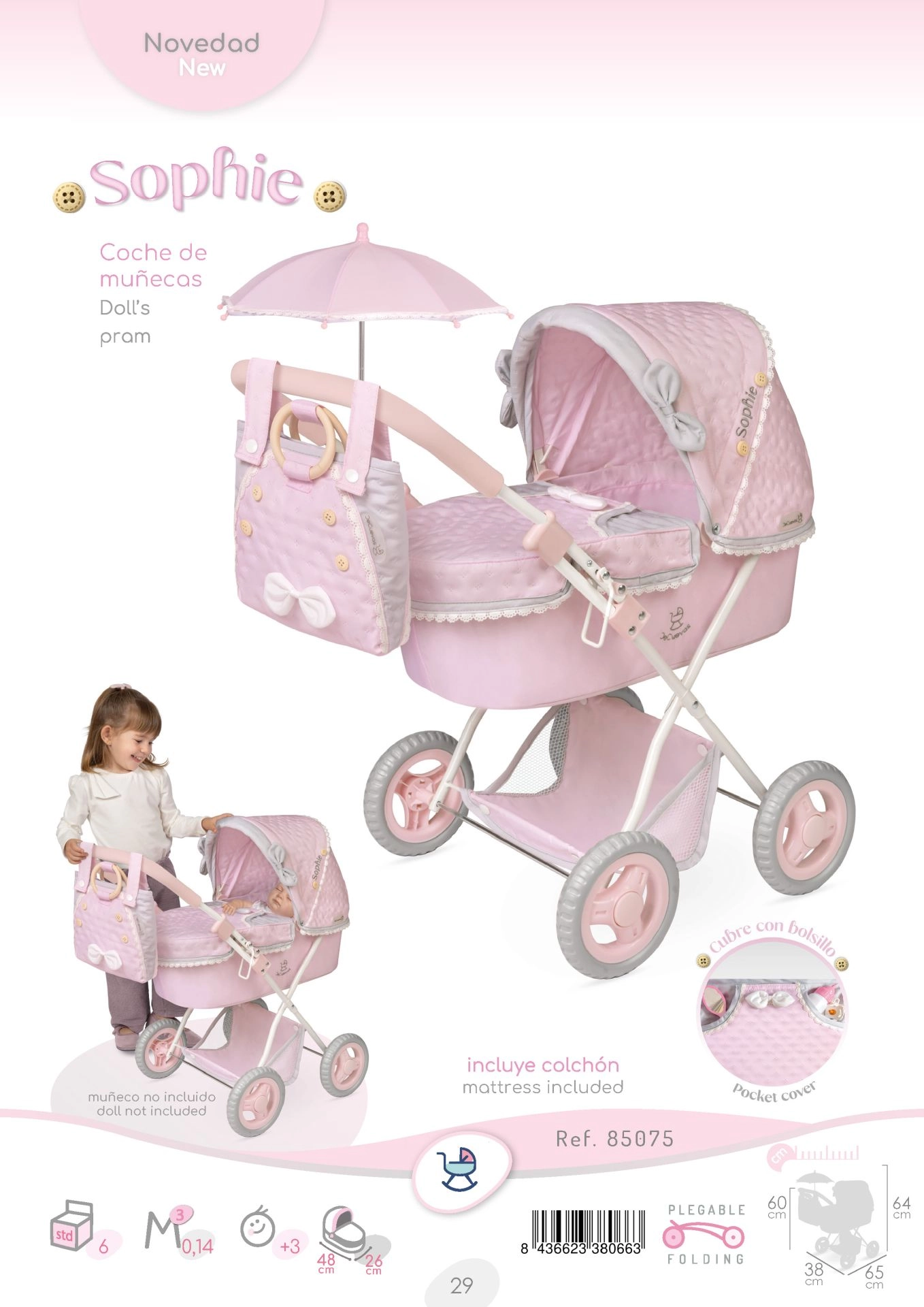 Elegante cochecito para muñecas de la colección SOPHIE que enamora por su delicado diseño en tonos rosados, su estructura plegable y su completo equipamiento. Incluye parasol, bolso desmontable, colchón suave y espacio de almacenamiento en la parte inferior. Gracias a la altura del manillar de 60 cm y su bajo peso, los niños lo manejan con facilidad. Ideal para pequeñas señoritas a partir de 3 años.