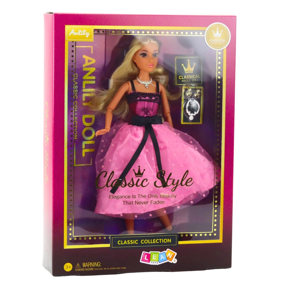 La elegante muñeca ANLILY con vestido de gala rosa‑negro encantará a cualquier pequeña amante de la moda. Tiene el pelo largo rubio para crear peinados, extremidades articuladas para un juego realista y abundantes accesorios: collares, pendientes y zapatos negros. Ideal para juego creativo e historias con estilo.