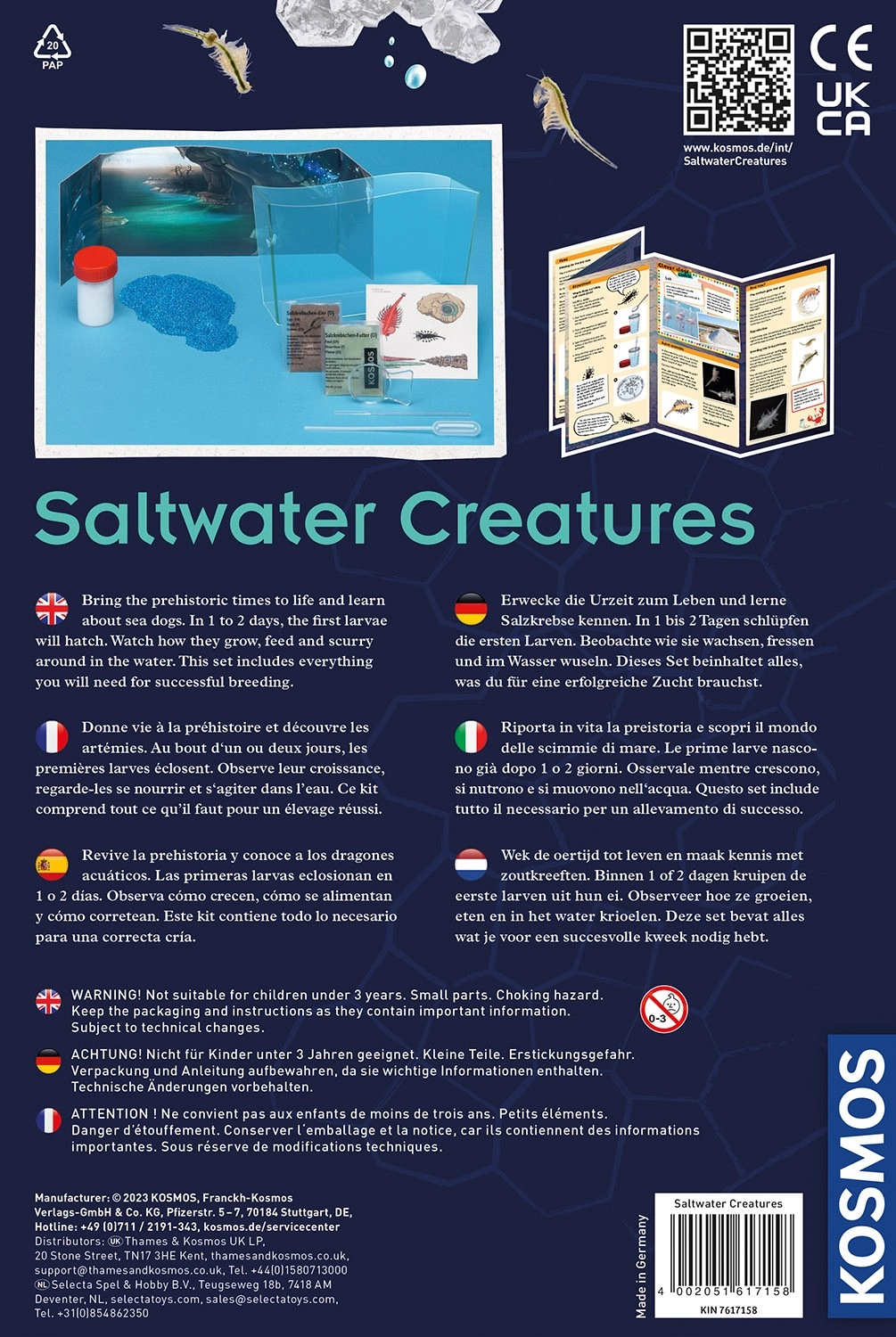 Descubre el fascinante mundo de los pequeños seres acuáticos con el set educativo de Kosmos para criar artemia salina. El set incluye todo lo necesario para empezar fácilmente: depósito, sal especial, alimento, huevos y manual en checo descargable mediante un código QR. Regalo ideal para niños de 8 a 12 años que fomenta el acercamiento a la naturaleza y a la ciencia.