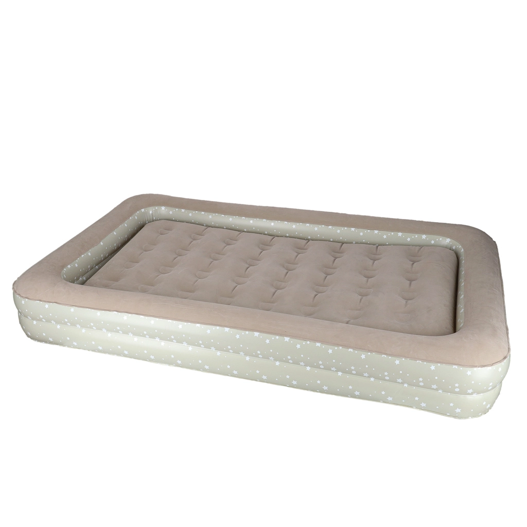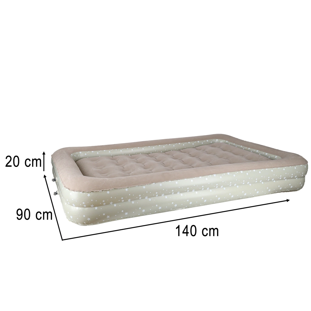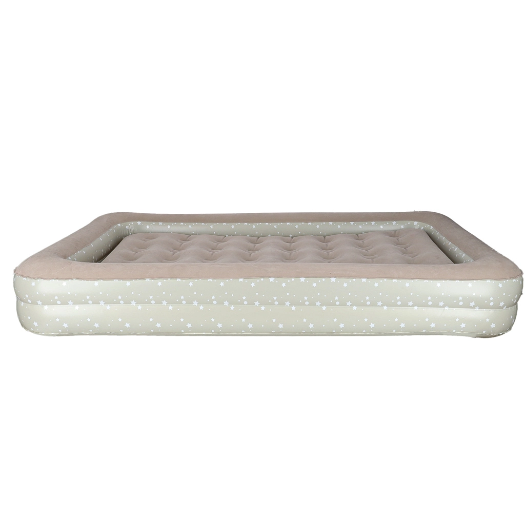 Cree un espacio cómodo y seguro para los niños en cualquier lugar: esta cama inflable infantil de dos piezas combina un marco exterior con bordes elevados y un colchón interior extraíble. La superficie flocada (tipo terciopelo) es agradable al tacto y evita que la ropa de cama se deslice. El elegante estampado de estrellas aporta un toque divertido.