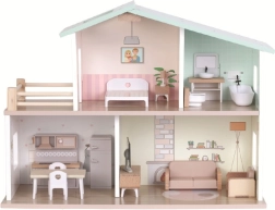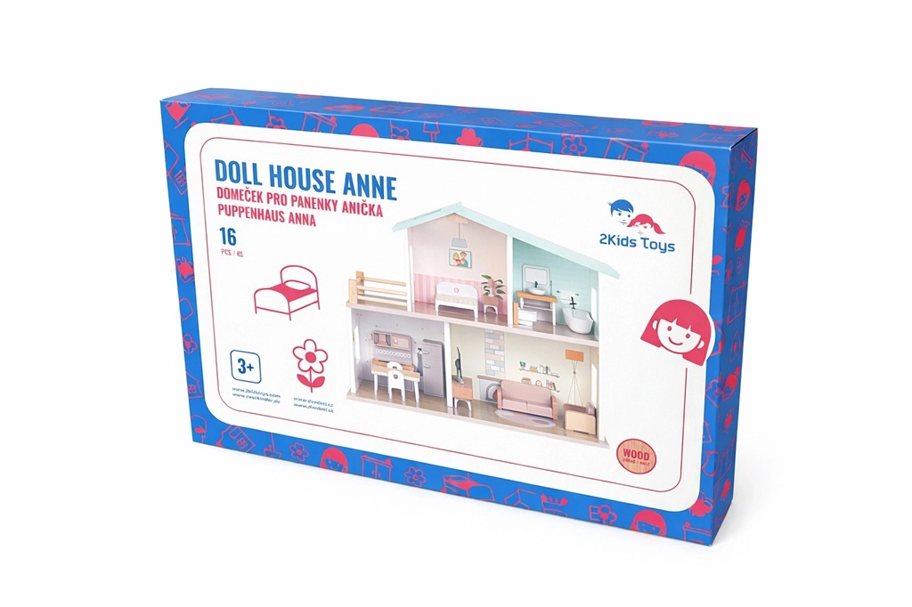 Descubre la preciosa casa de muñecas de madera Anička de 2Kids Toys con dos plantas, balcón y habitaciones totalmente equipadas. Gracias a 16 piezas de muebles y accesorios, los niños disfrutarán de horas de juego creativo de roles, desarrollando la imaginación y las habilidades sociales. Su acabado de madera de alta calidad, colores suaves y construcción estable la convierten en un encantador complemento para la habitación infantil. Se incluye manual de montaje; la casa se entrega desmontada. A partir de 3 años.