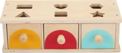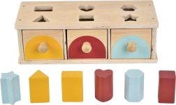 La placa superior con recortes guía al niño hacia una inserción precisa, mientras que los tres cajones con tiradores permiten retirar fácilmente las piezas y repetir el juego. Su construcción resistente garantiza una larga vida útil y un juego seguro a partir de 1 año.