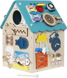 El diseño combina madera natural con colores agradables, lo que convierte a la casita en un accesorio estético y resistente para la sala de juegos. El juguete apoya habilidades clave para la autonomía y la vida cotidiana: los niños practican la coordinación, la resolución de problemas y la concentración.