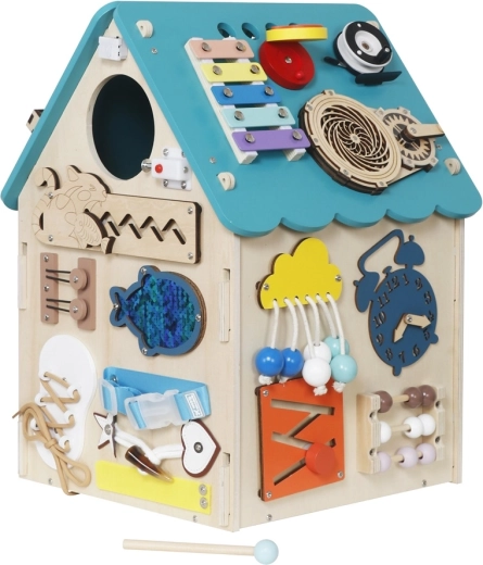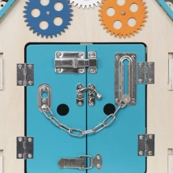 Este tablero de actividades de madera de alta calidad con forma de casita se inspira en los principios Montessori y motiva a los niños a explorar de forma autónoma. Cada lado aporta nuevos estímulos: desde cerraduras y ganchos reales hasta un temporizador giratorio y un colorido laberinto con un pececito. El interior de la casita se ilumina y el interruptor funcional con luz intensifica la experiencia sensorial. El teléfono musical entretiene con melodías y sonidos, y el xilófono con baqueta desarrolla el sentido del ritmo y la audición.