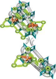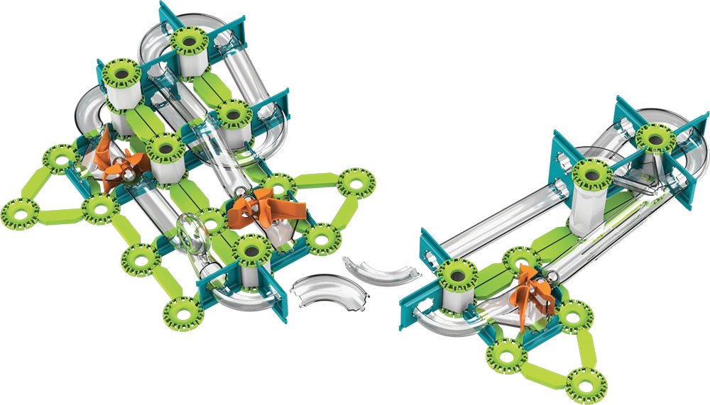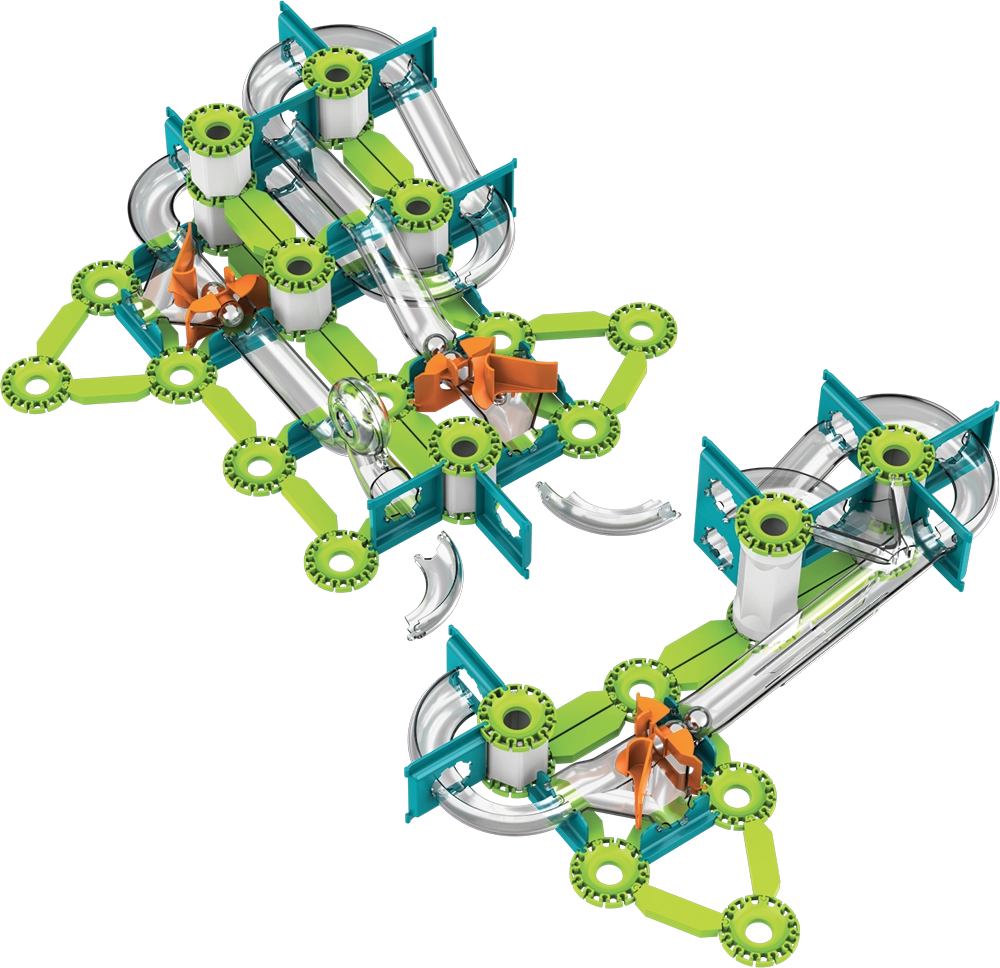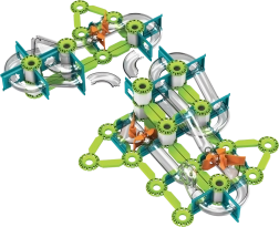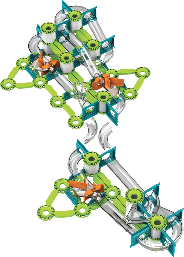 Las pistas verdes, los soportes y los desencadenadores naranjas se conectan fácilmente en recorridos estables. Los elementos interactivos guían las canicas por curvas y caídas.