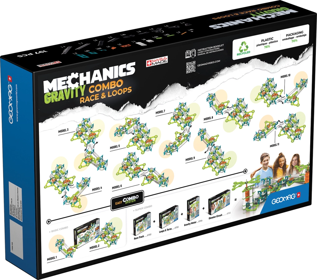 GEOMAG Mechanics Gravity Combo es una pista de canicas inteligente donde la gravedad y el magnetismo son protagonistas. Construye recorridos variados, observa el movimiento de las canicas de acero y experimenta con engranajes, desencadenadores y la dirección del flujo de canicas. Cada reconstrucción aporta nuevos retos y la alegría del descubrimiento.