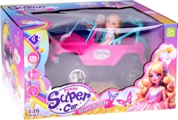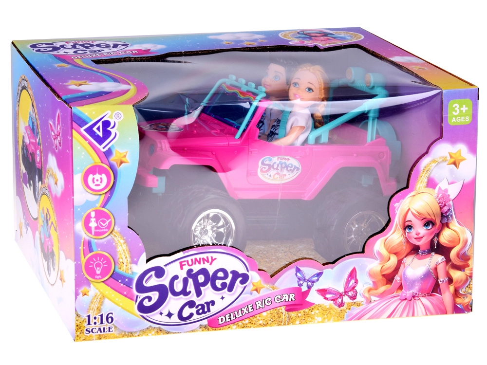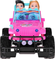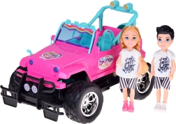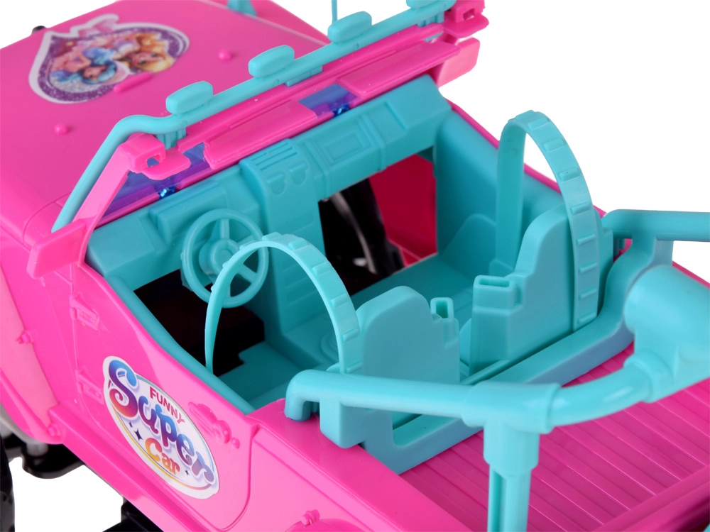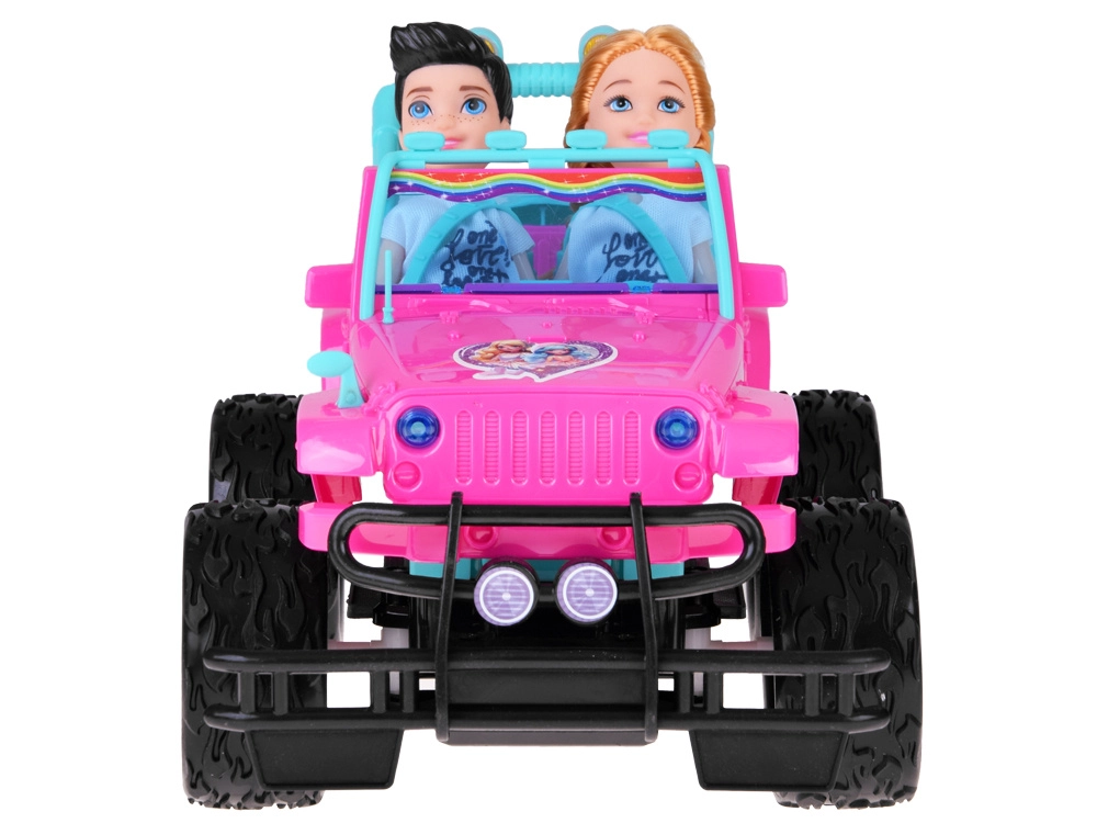 Emprende un safari de aventuras con el todoterreno rosa para muñecas. La cabina abierta con asientos turquesa y cinturones ajustables sienta de forma segura a las figuras incluidas. Las grandes ruedas de goma y el parachoques aportan estilo off-road, mientras que los faros LED delanteros añaden un efecto realista durante la conducción.