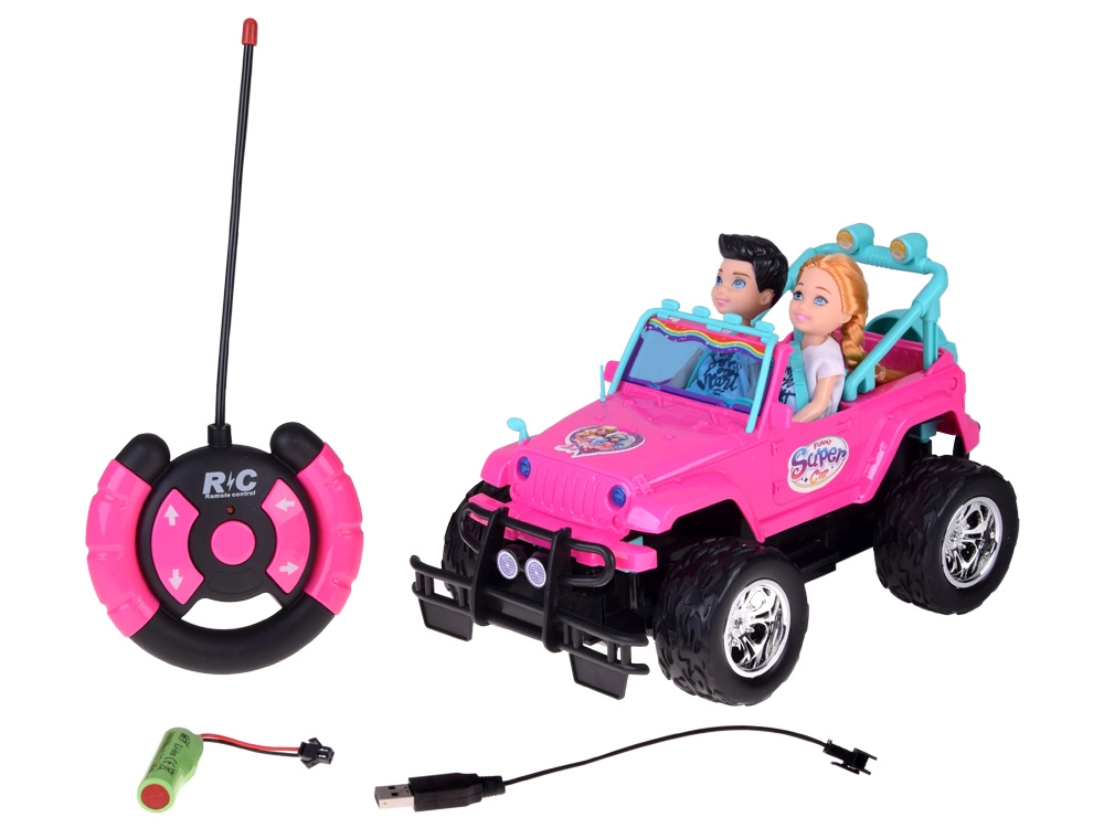 Divertido set para pequeñas y pequeños conductores: coche todoterreno RC rosa con ruedas grandes y dos figuras (niña y niño). El coche tiene faros delanteros luminosos, neumáticos de goma para buena adherencia, cinturones de seguridad ajustables en los asientos y control en 4 direcciones mediante un mando rosa. Incluye batería recargable de 3,7 V con carga USB.