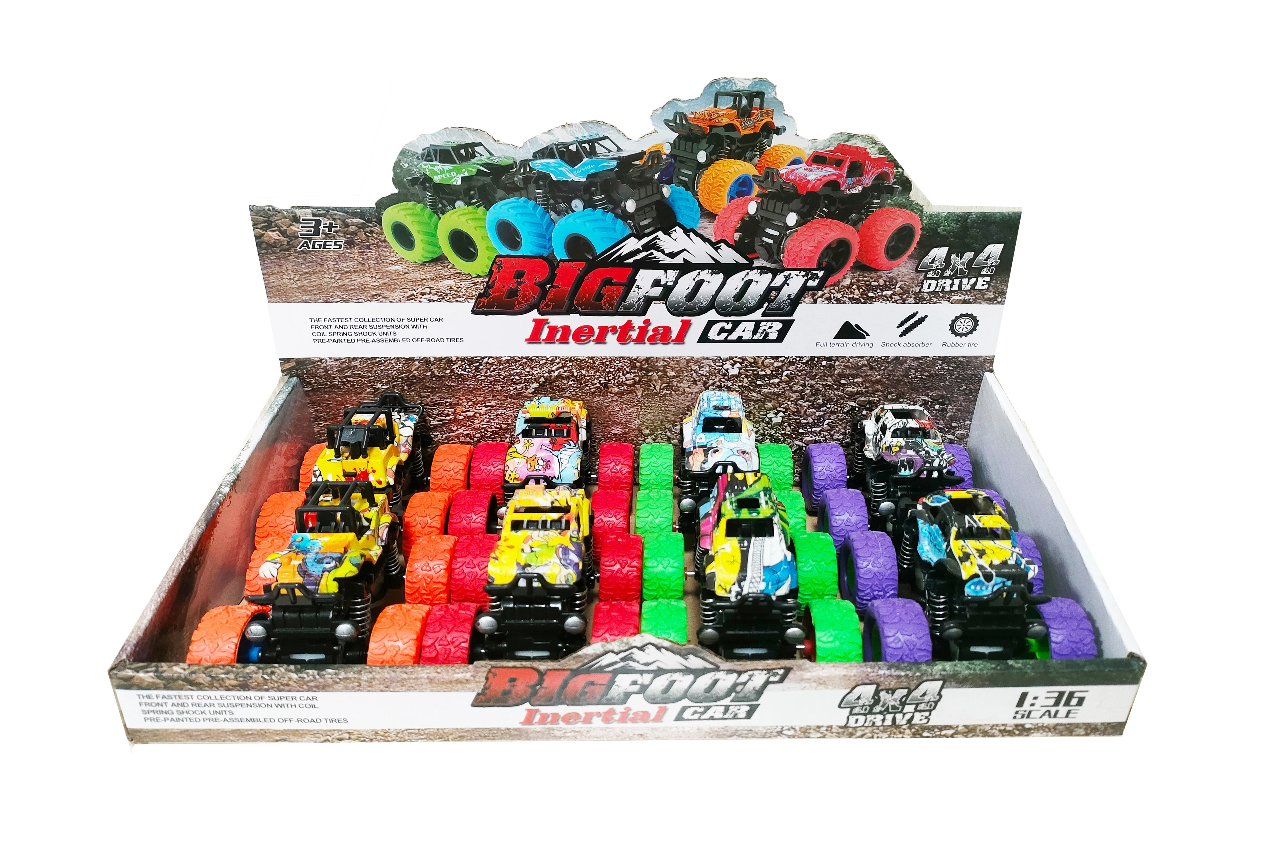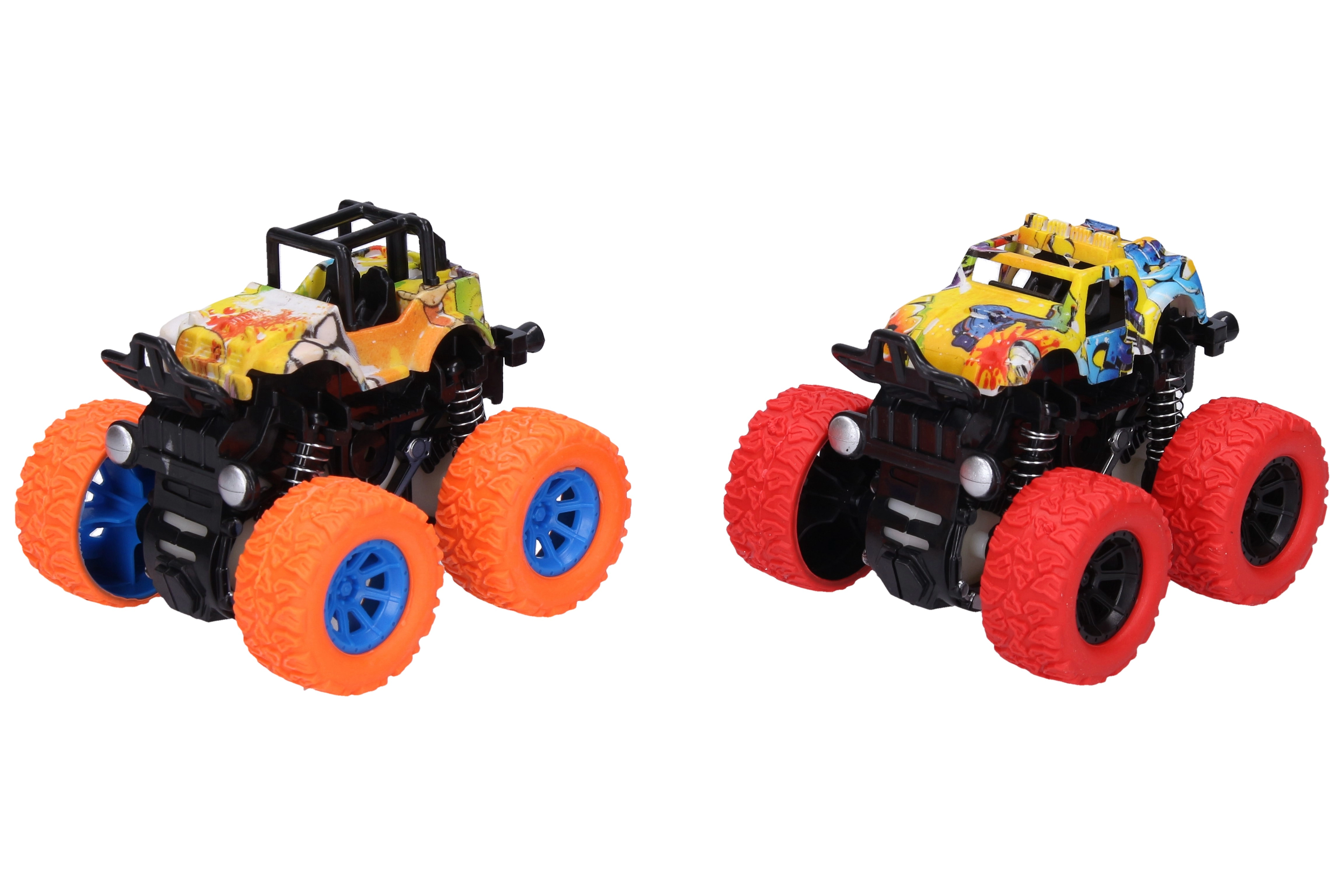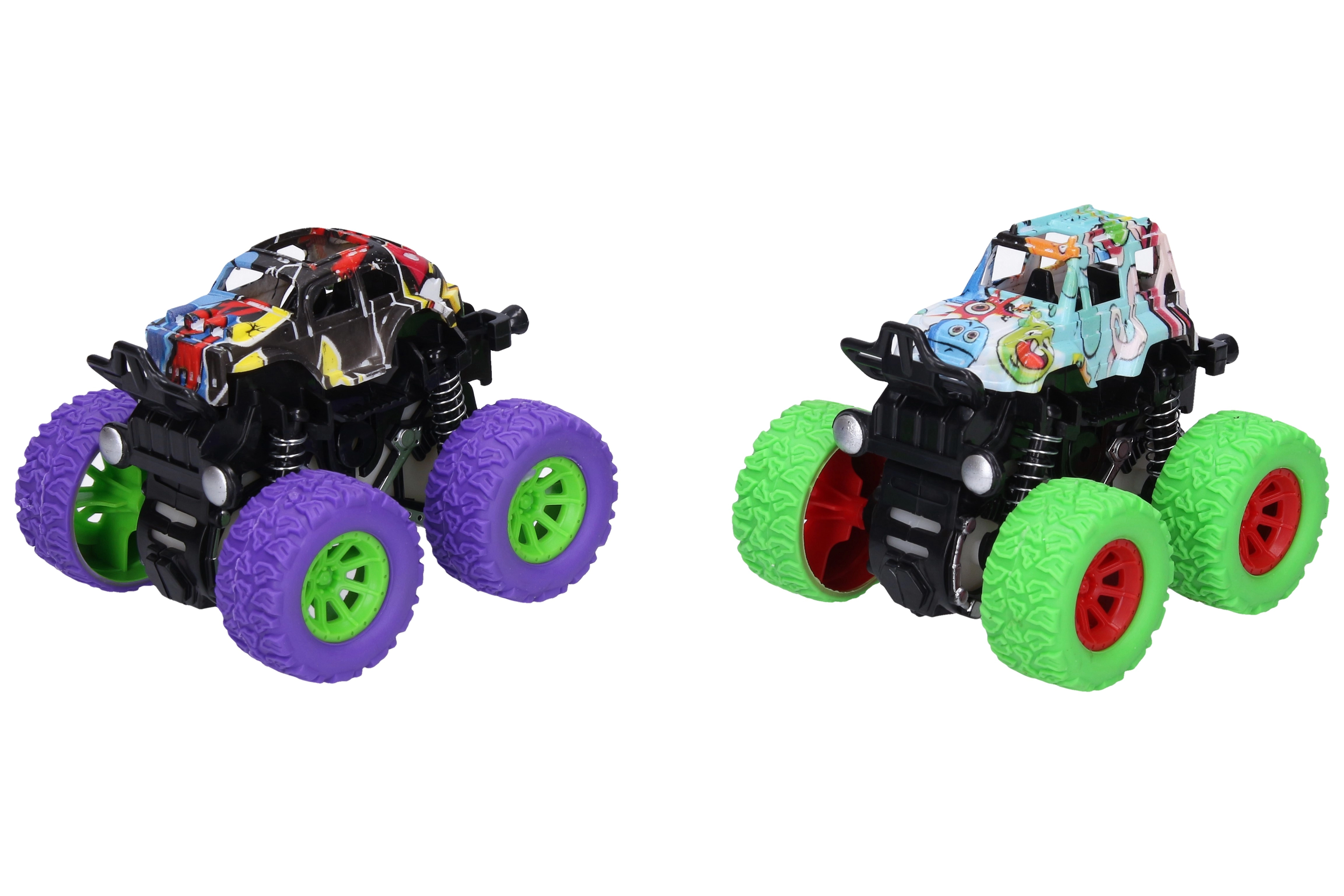 Estos cochecitos todoterreno de unos 9 cm con propulsión por fricción (inercia) solo necesitan tirar y soltar: salen disparados a gran velocidad. Las carrocerías con motivos de graffiti en diferentes variantes de color llaman la atención y fomentan el juego creativo.