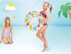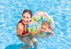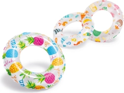 Ligero y resistente flotador inflable INTEX con un diámetro de 61 cm, ideal para jugar en el agua y dar los primeros pasos en el aprendizaje de la natación. Fabricado en PVC resistente (0,18 mm), con motivos coloridos y agarre cómodo. El diseño se selecciona aleatoriamente.