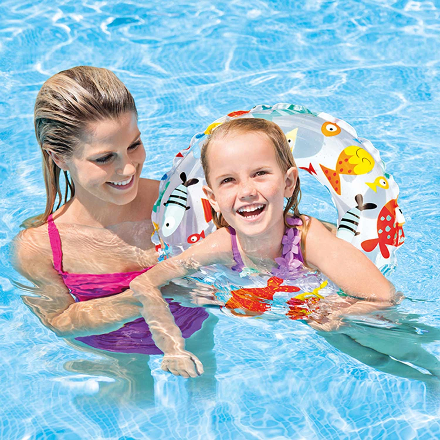 El diámetro de 61 cm proporciona flotabilidad suficiente y comodidad para nadadores jóvenes tanto en piscina como en el mar.