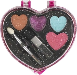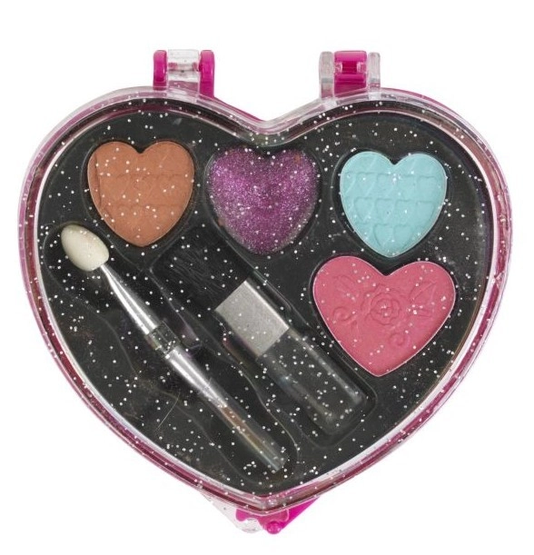 Brillo de labios, sombras de ojos y colorete en un estuche con forma de corazón y cierre, seguros para la piel infantil e ideales para el primer maquillaje.