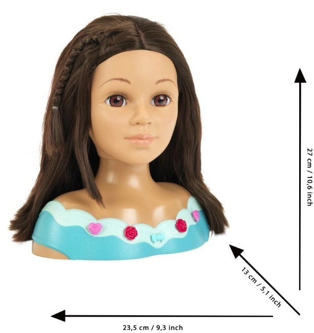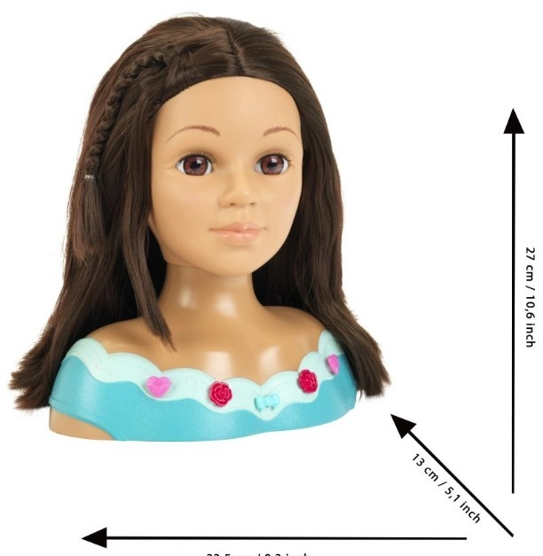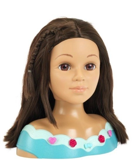 Cabeza realista con cabello largo y lavable que permite cepillar, peinar y crear trenzas y peinados como en una peluquería.