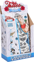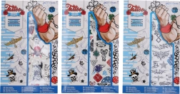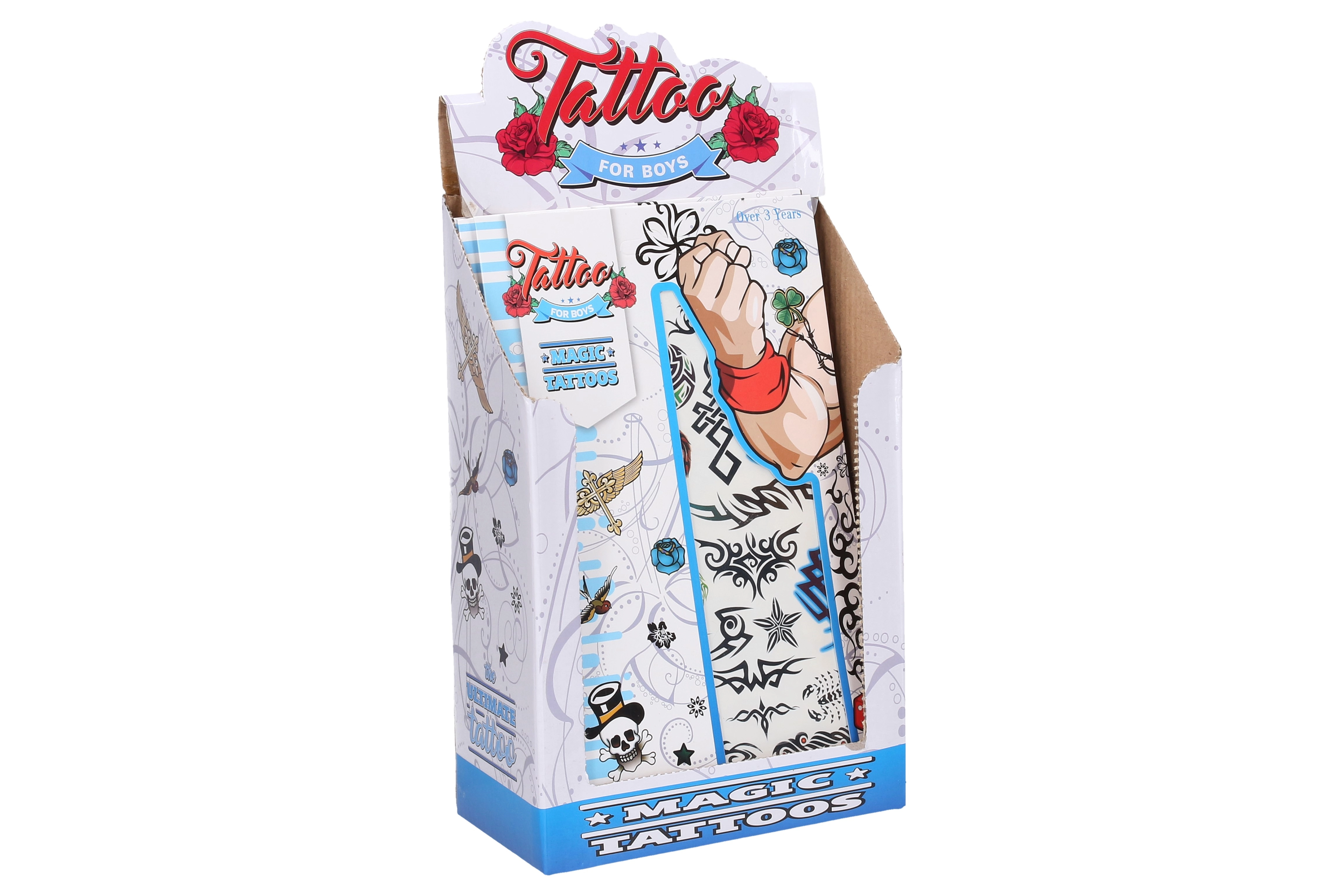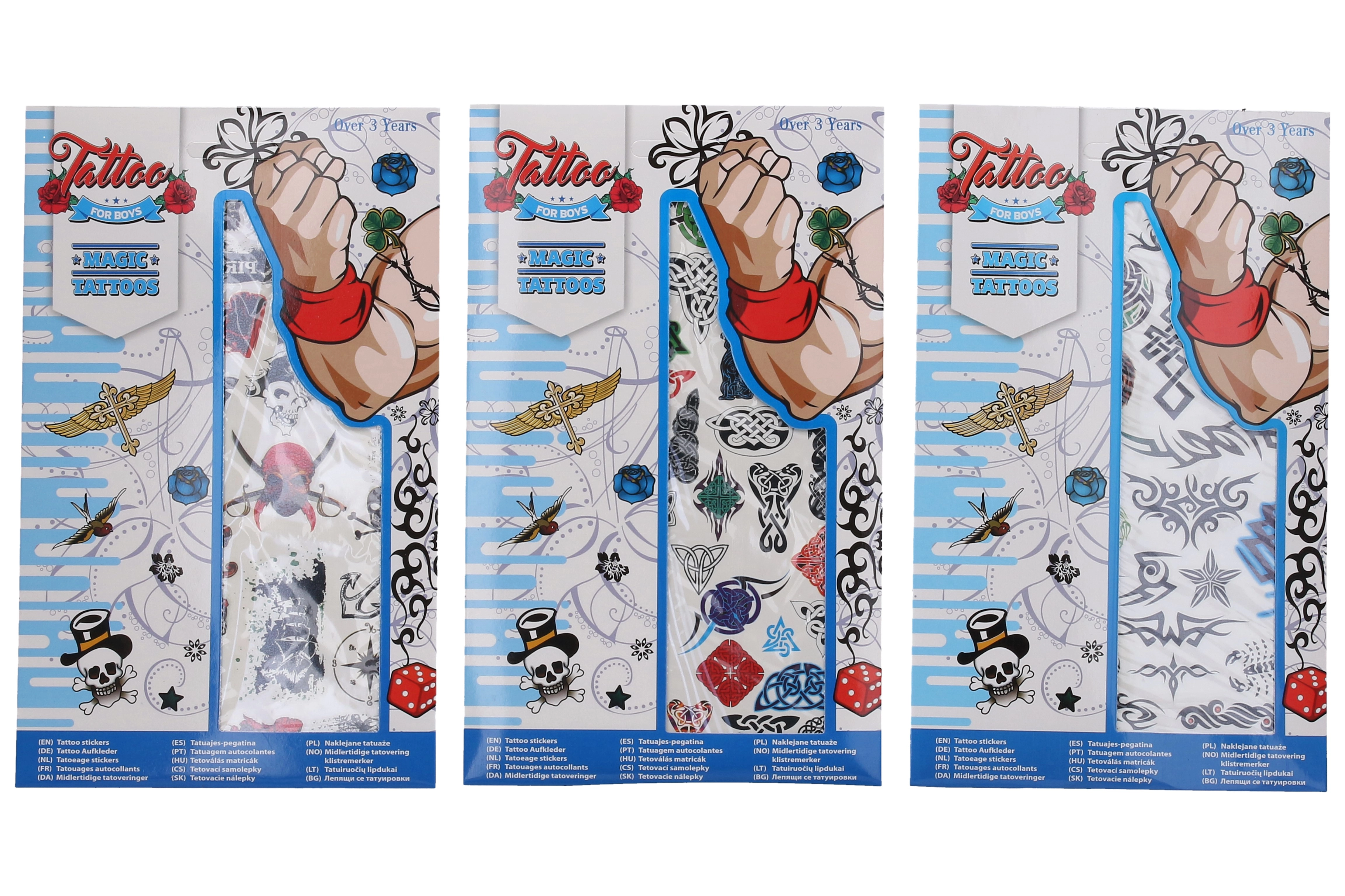 Divertidas y seguras pegatinas de tatuaje para niños en una práctica hoja de 25 cm de largo. Aplicación sencilla, retirada rápida del papel y diseños geniales en 3 variantes. Ideal para fiestas, regalos y el juego diario.