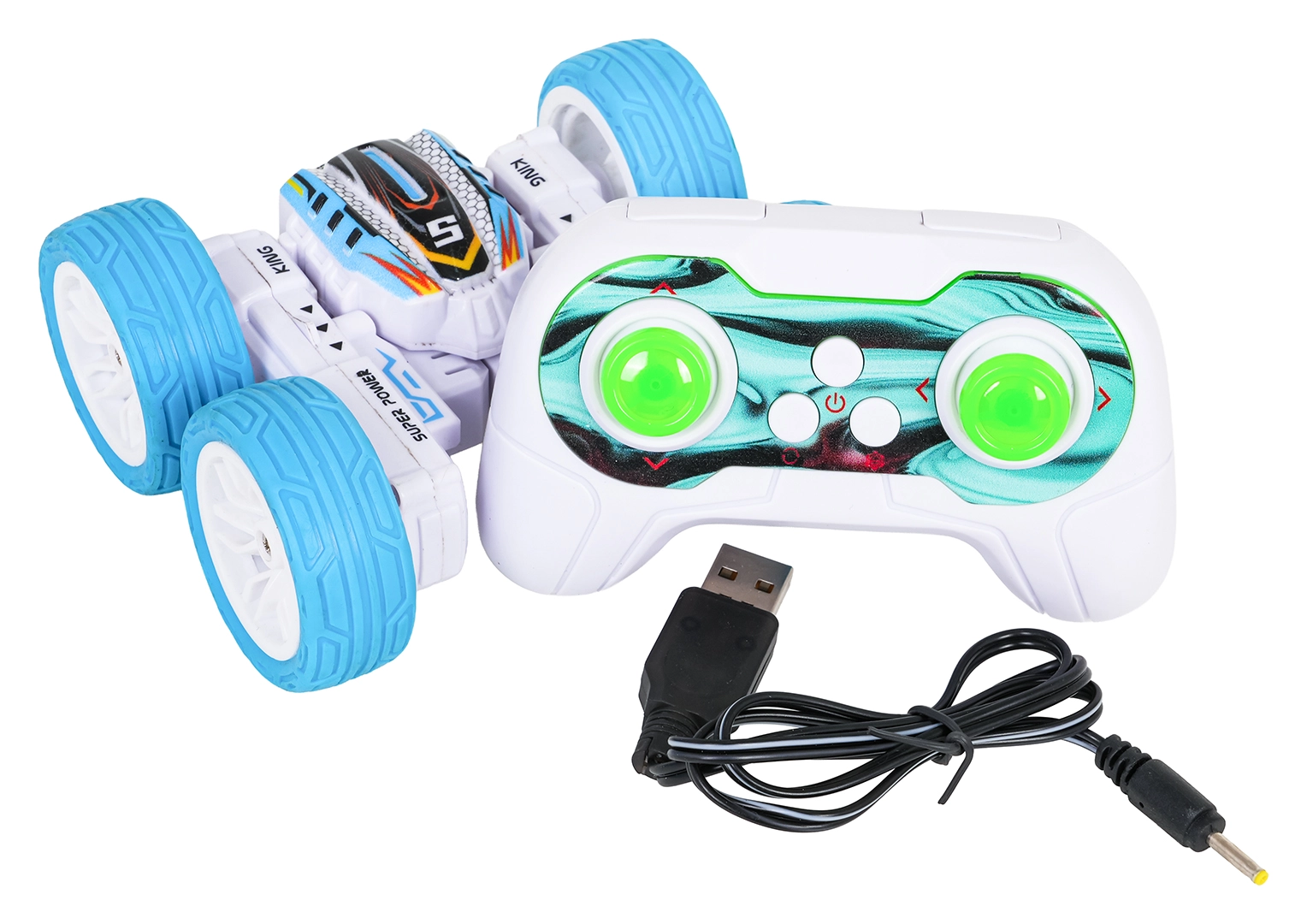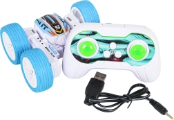 El coche acrobático RC POWER STUNT destaca por su agilidad y trucos llamativos. Gracias a sus grandes ruedas de goma supera irregularidades, avanza y retrocede, gira a derecha e izquierda, se desplaza de lado y puede girar 360°. El diseño de doble cara permite continuar la marcha incluso tras voltearse. Las luces LED de colores aportan un espectáculo impresionante.