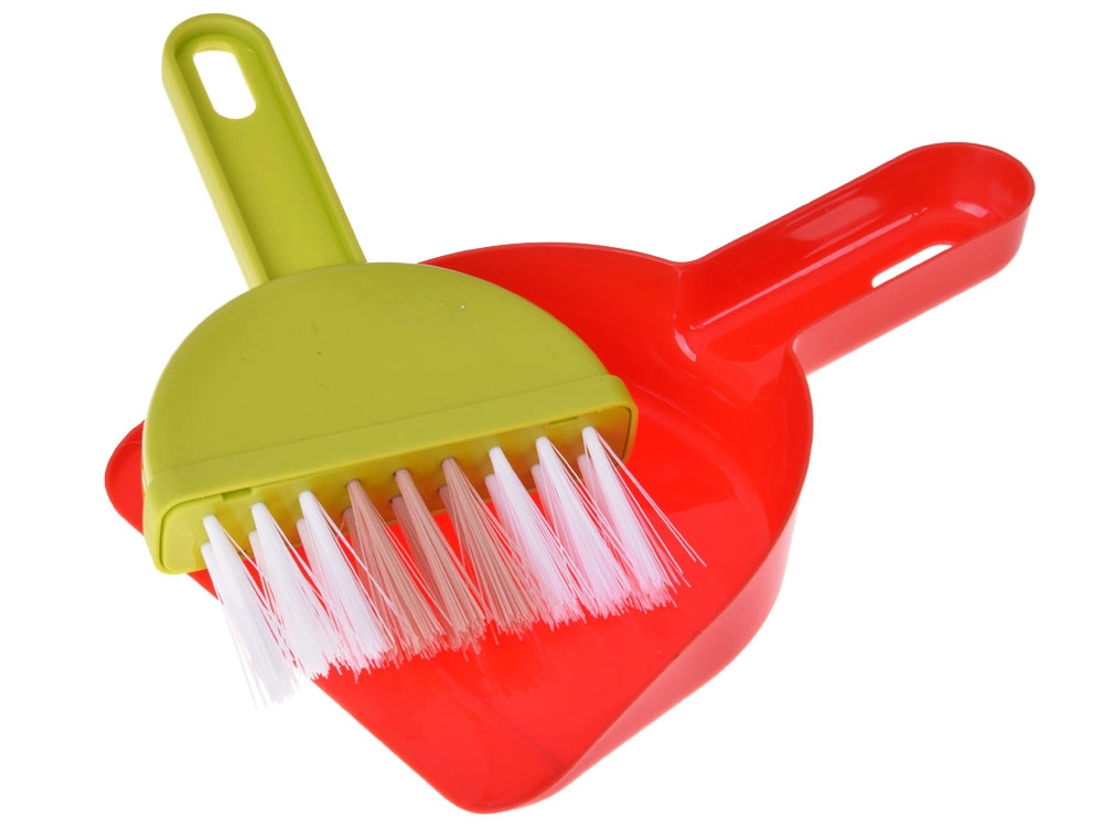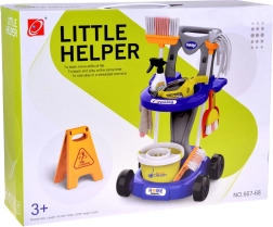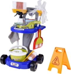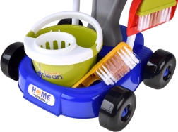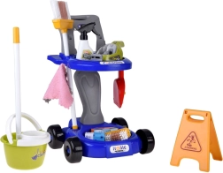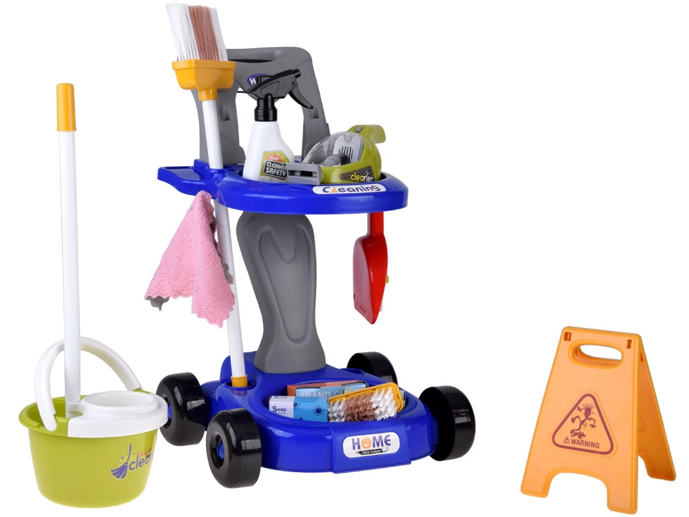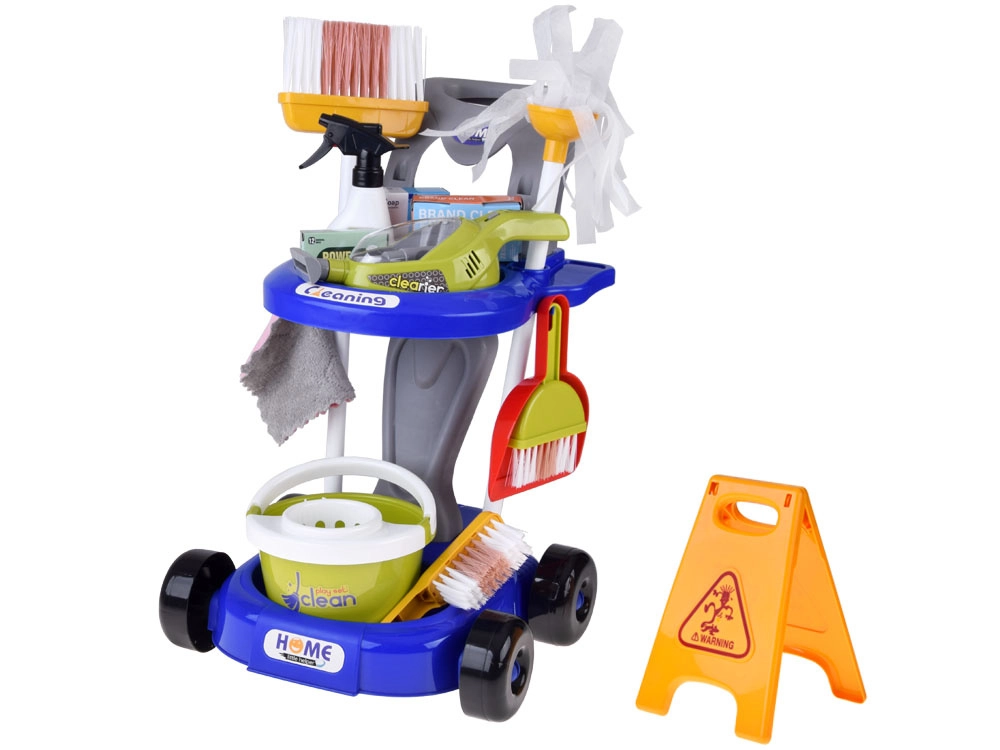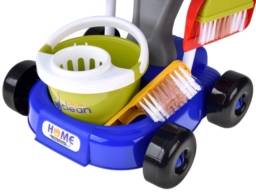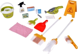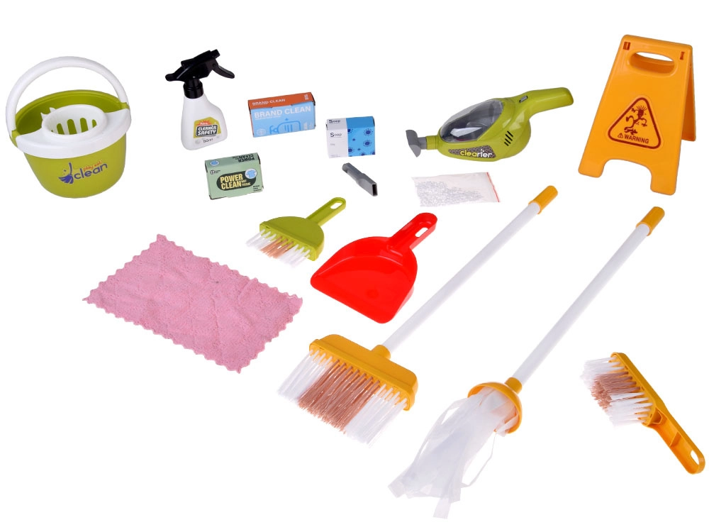 Mopa, escoba, recogedor con cepillo, cubo con escurridor, paño, pulverizador, señal de advertencia y cajitas: todo lo que los niños necesitan para imitar las tareas del hogar.
