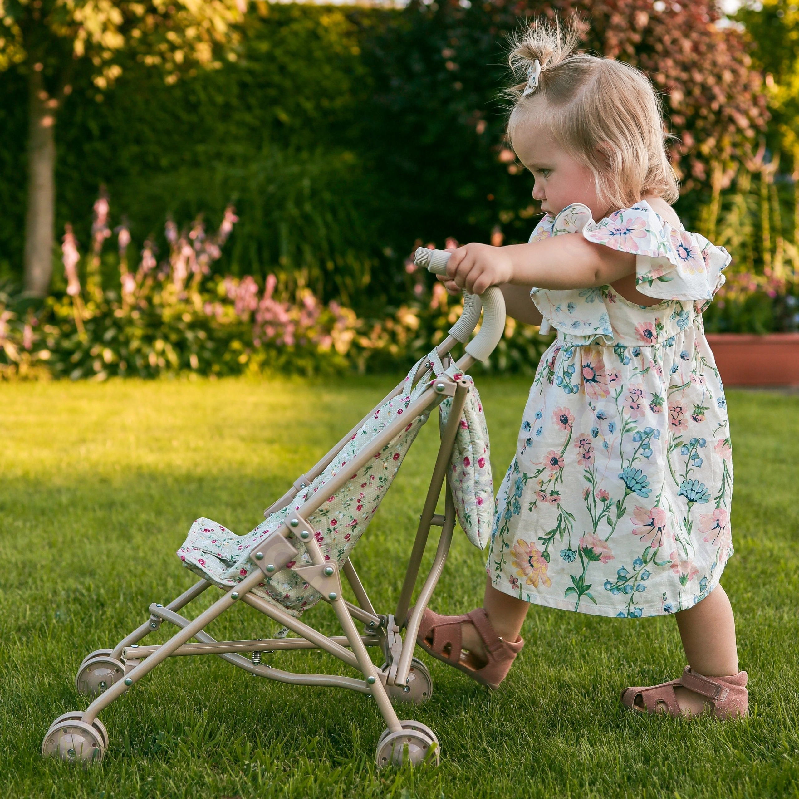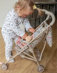 Un compañero pequeño pero bien pensado para grandes juegos de mamás y papás. Este carrito para muñecas en un delicado tono crema con estampado floral combina ligereza, estabilidad y plegado rápido a dimensiones compactas. Se transporta con facilidad, cabe en el maletero o en el armario y está listo para la diversión en un momento.