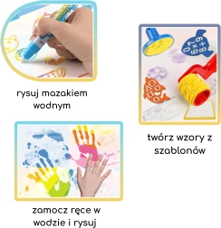 - Set de accesorios completo – 3 rotuladores de agua, 3 sellos, rodillo, plantillas, cochecito