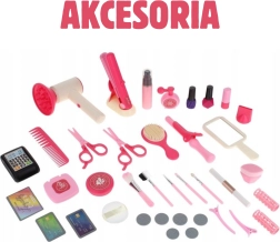 - Maletín con asa, 2 pinzas, 4 rulos, esponja para polvos, pulverizador/mist, 7 brochas de maquillaje, 2 esmaltes de uñas, “máscara de pestañas”, “perfume”, sombras de ojos, “polvos”, rizador, plancha de pelo, base para la plancha, peine, cepillo, espejo, secador con accesorios intercambiables (difusor y boquilla plana), terminal de pago, juego de dinero de juguete, tarjeta de cliente, tarjeta de pago, cajas de cartón de cosmética (champú, acondicionador, gel), cartel de cartón “Beauty Salon”, 2 pares de tijeras, “barra de labios”