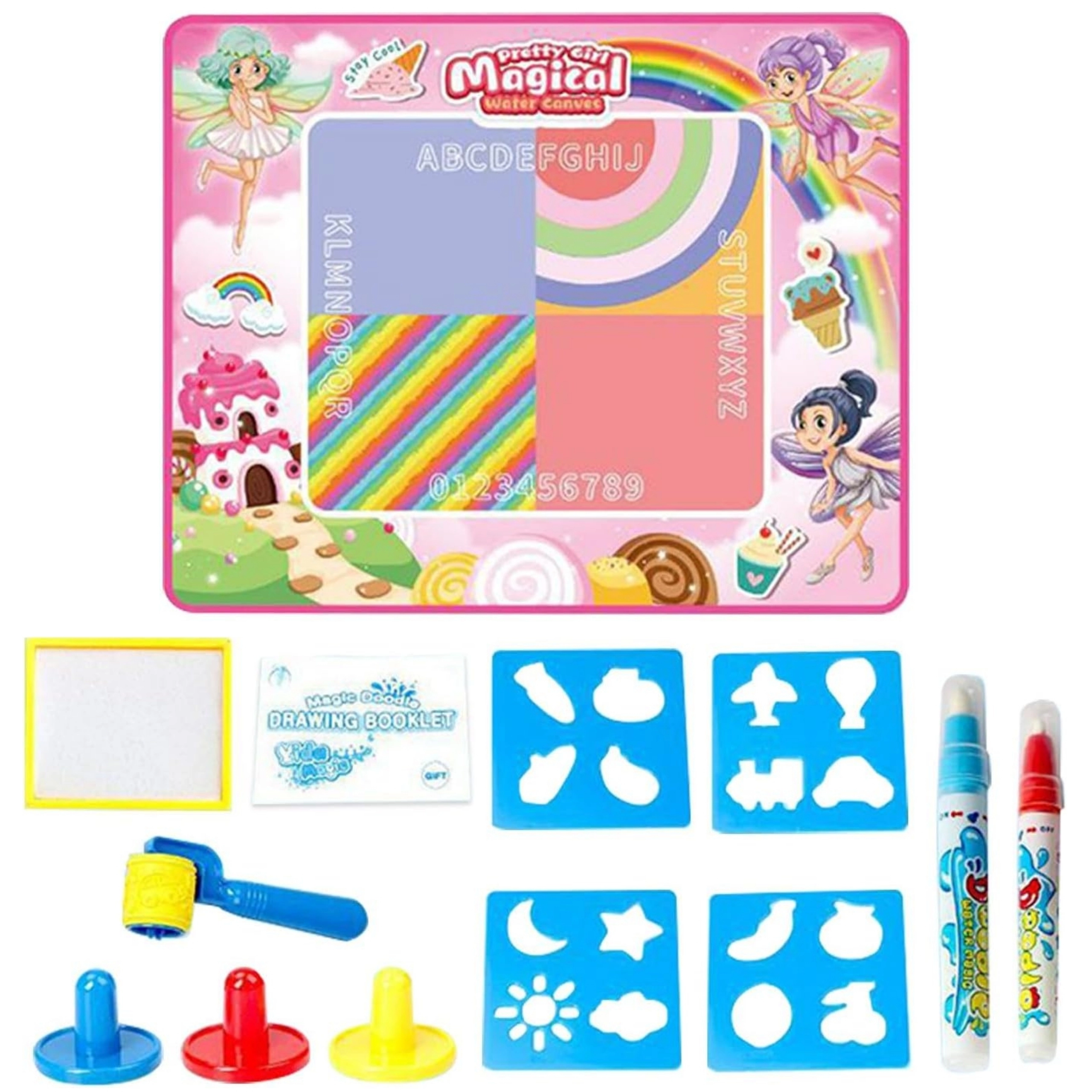 - 1× alfombrilla grande de agua, 6× rotulador de agua, 1× rodillo, 3× sello con mango, 1× almohadilla para estampaciones, 4× plantilla, 1× folleto para dibujar