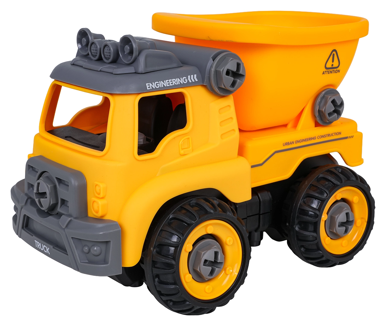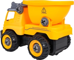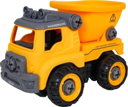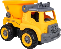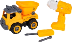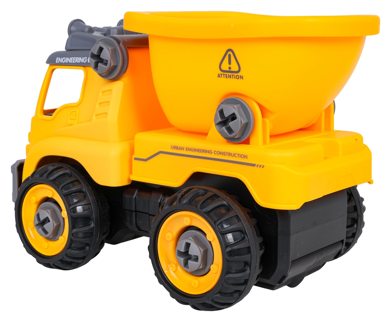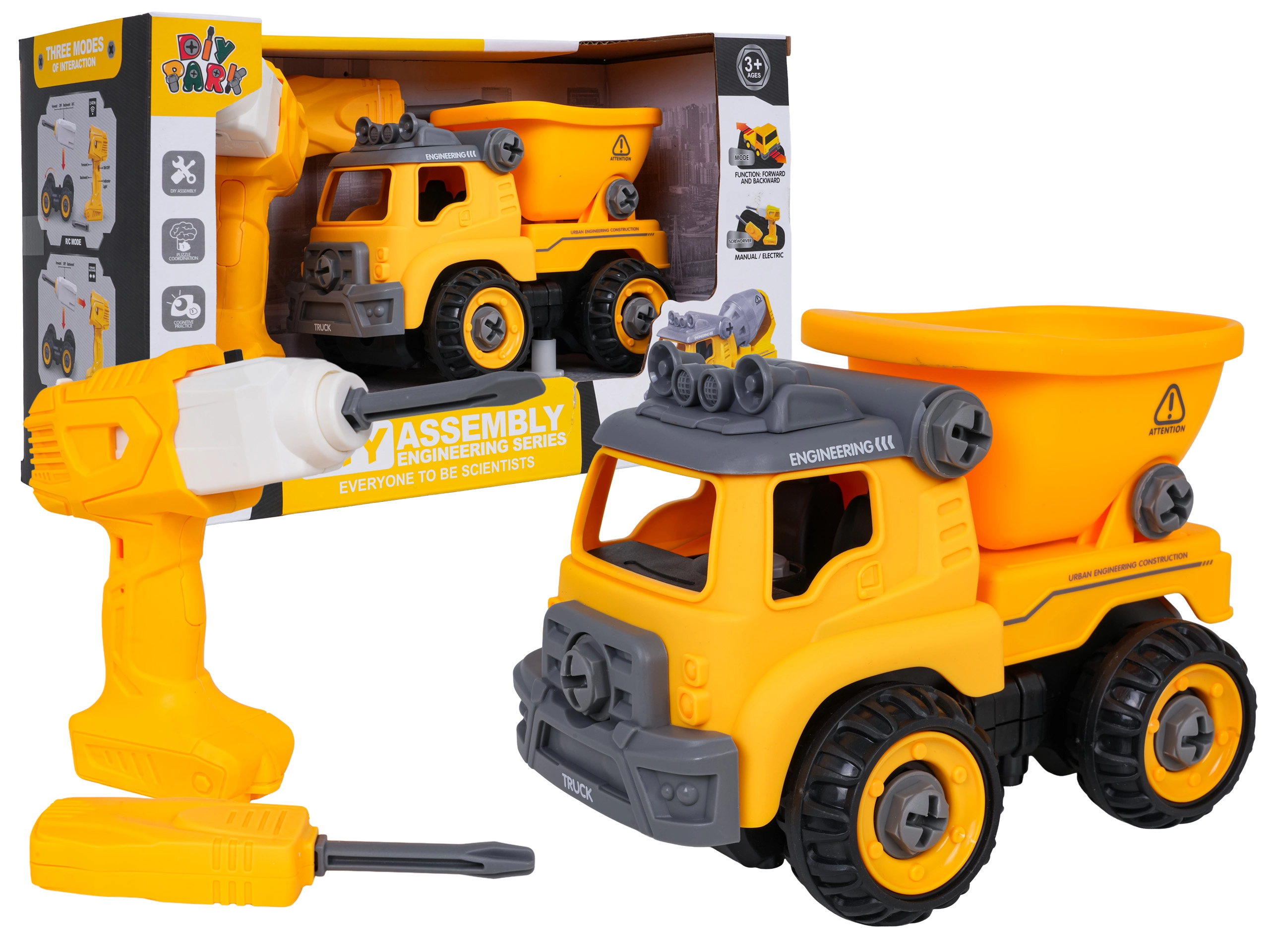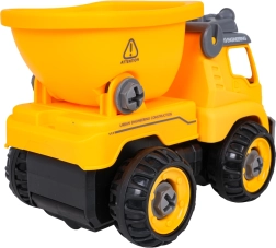 El camión volquete de construcción se entrega completamente montado y listo para usar. Con el taladro a pilas y el destornillador manual incluidos, los niños pueden desmontarlo en piezas y volver a montarlo. El vehículo está fabricado en plástico resistente con colores vivos, por lo que soporta el juego diario.