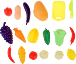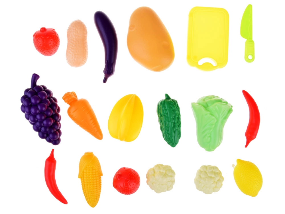 Las formas y colores diversos fomentan la imaginación, el aprendizaje de los nombres de los alimentos y los roles de vendedor o cliente.