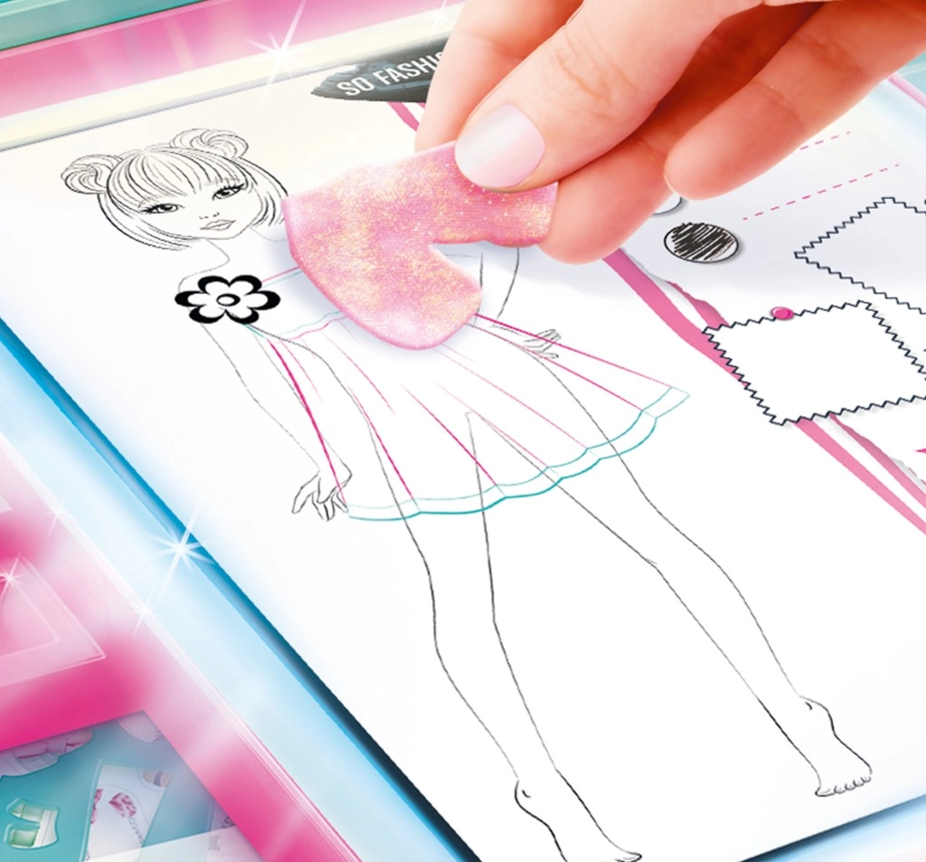 En la caja encontrarás todo lo que un pequeño diseñador necesita: modelos para calcar, plantillas, láminas y rollitos impresos, telas autoadhesivas, lápices de colores, un rotulador y gemas con adhesivos para un acabado perfecto. Solo necesitas 3× pilas AAA y podrás empezar a crear.