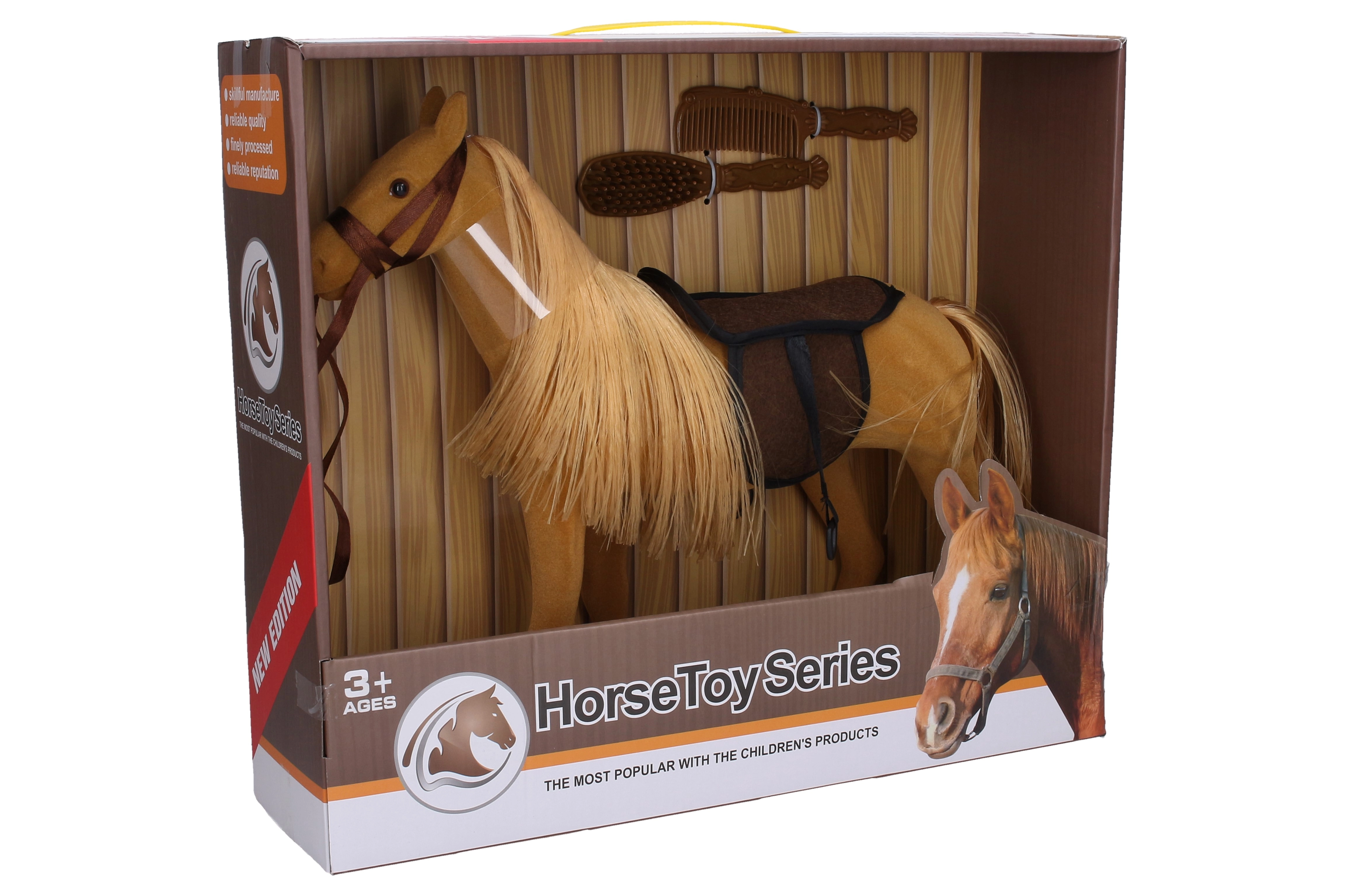 Este caballo de peluche, suave y agradable al tacto, es ideal para abrazar y para juegos de fantasía. Gracias a la silla incluida y a los dos peines, los niños pueden practicar el cuidado del caballo, desarrollar la motricidad fina e inventar sus propias historias.