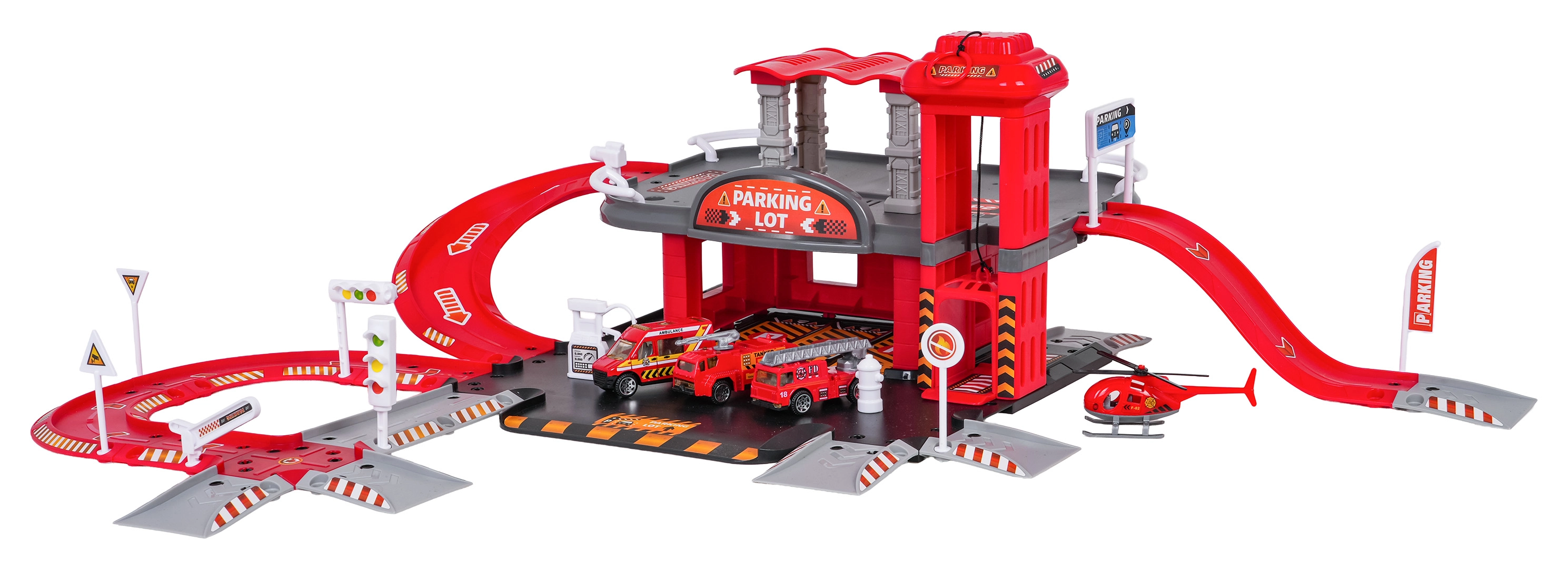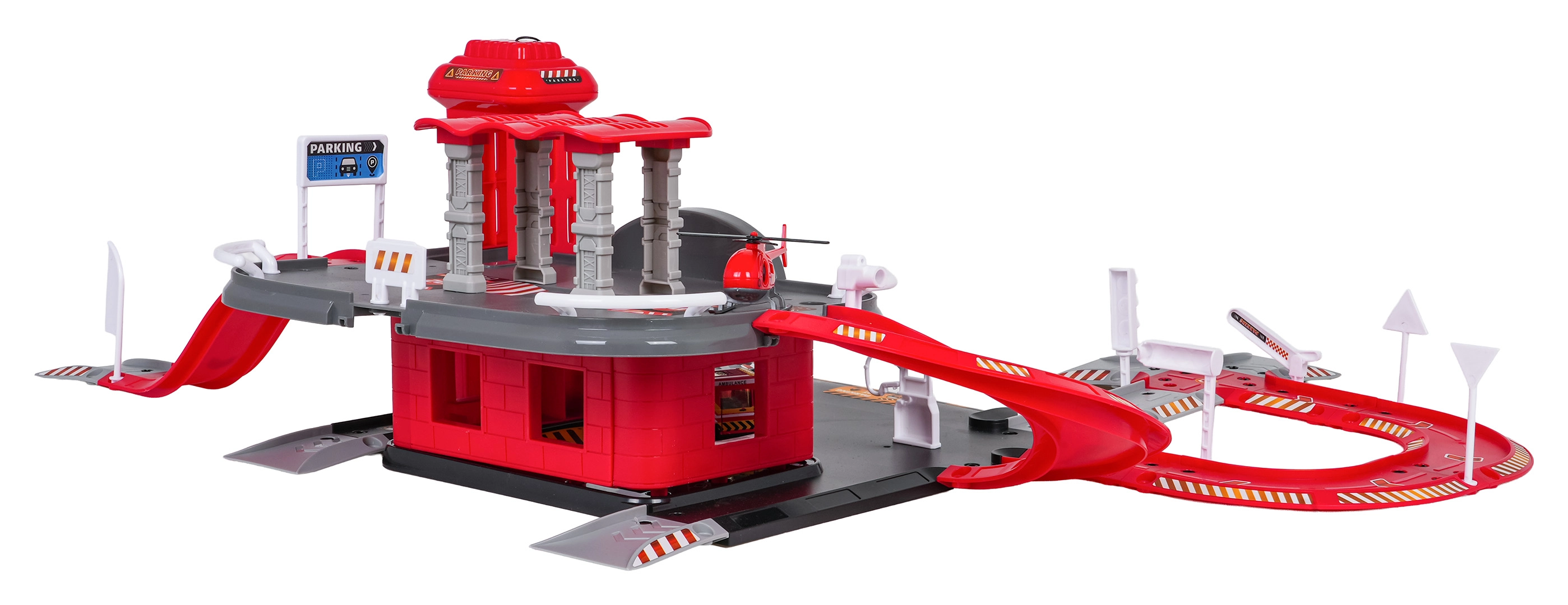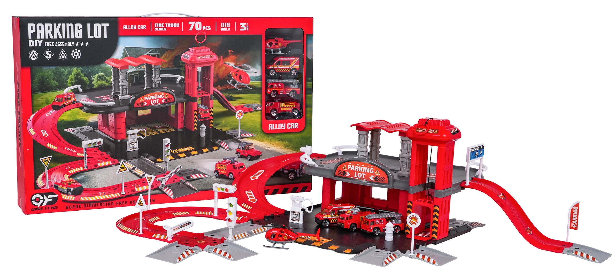 Este set de estación de bomberos, elaborado con detalle, combina diversión y desarrollo de habilidades. Los niños pueden repostar en la gasolinera, conducir por la carretera, subir el vehículo al piso con el ascensor manual y aparcar en las plazas designadas. Desde el piso superior los vehículos regresan en el ascensor o descienden a toda velocidad por la rampa helicoidal.