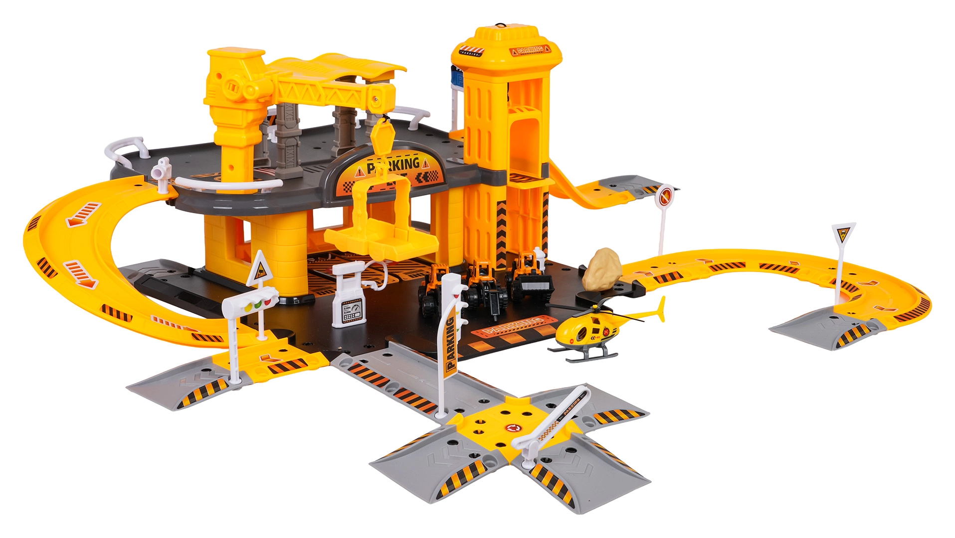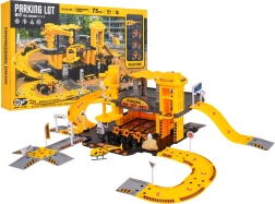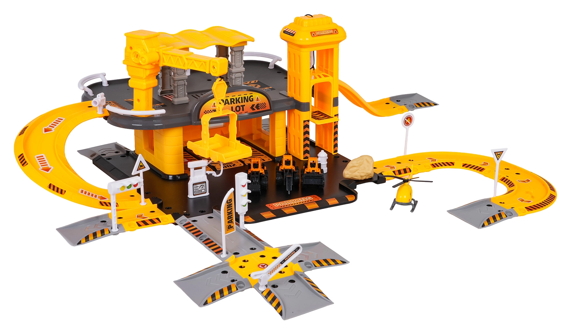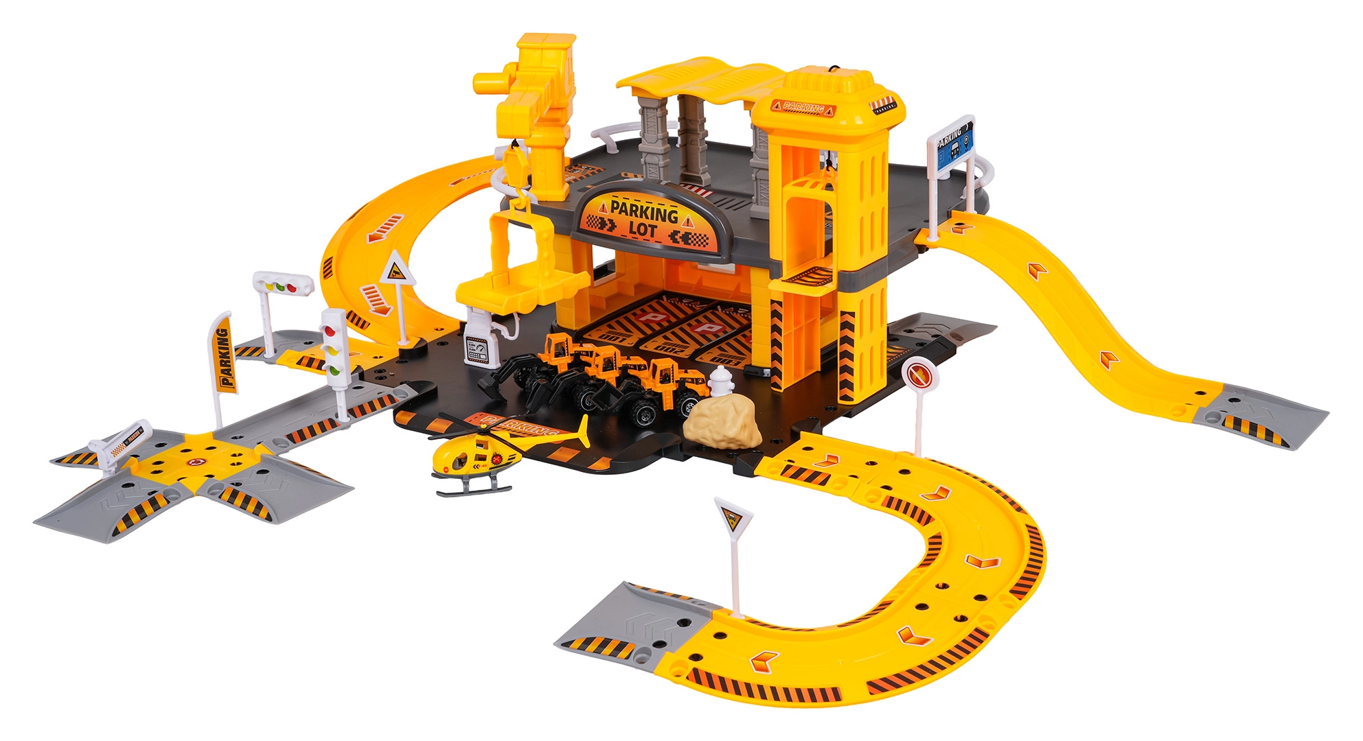 - Elementos del aparcamiento, 3 vehículos de construcción (martillo, excavadora, cargadora), helicóptero, señales de tráfico, semáforos, barreras, pegatinas, instrucciones