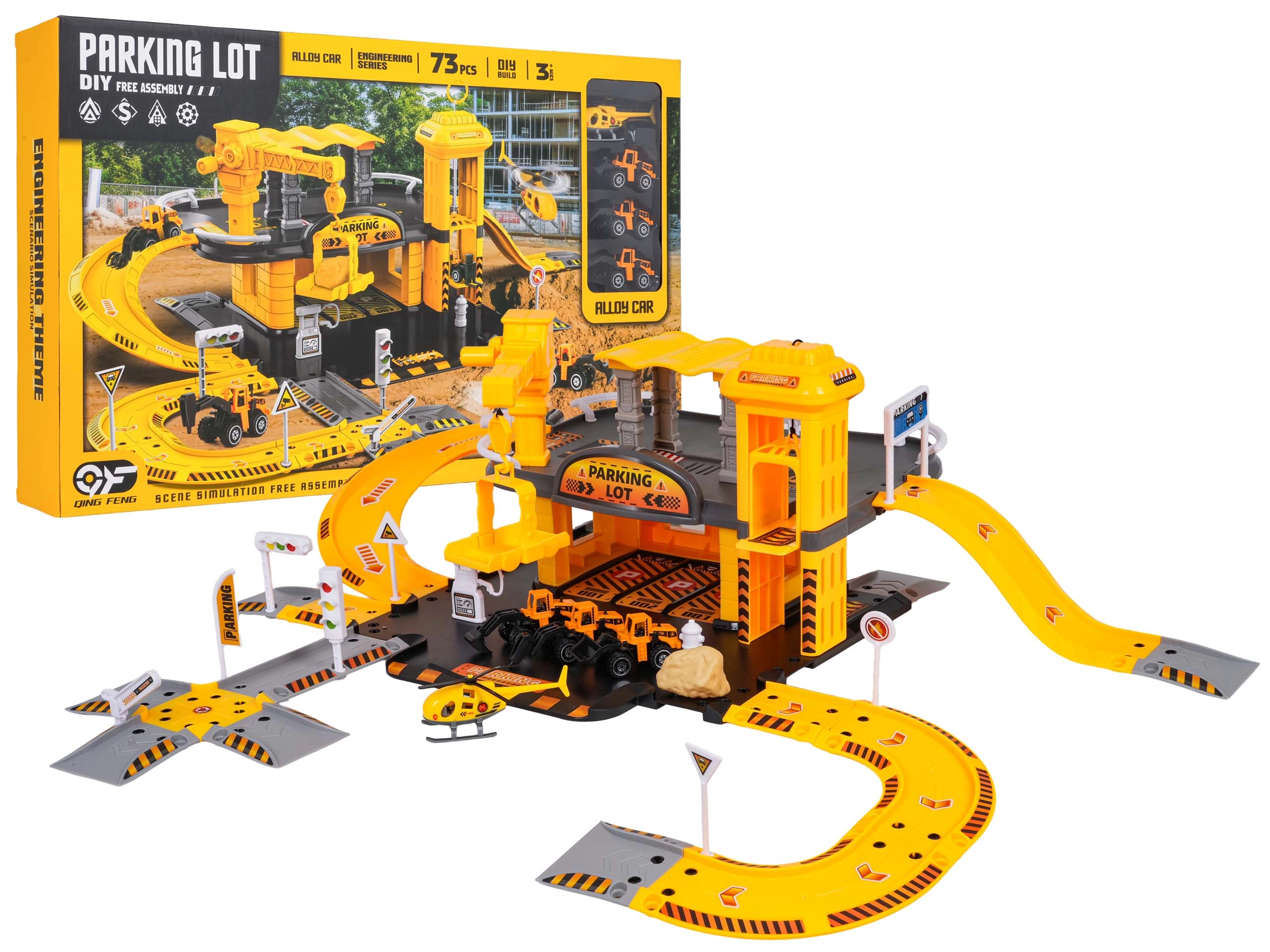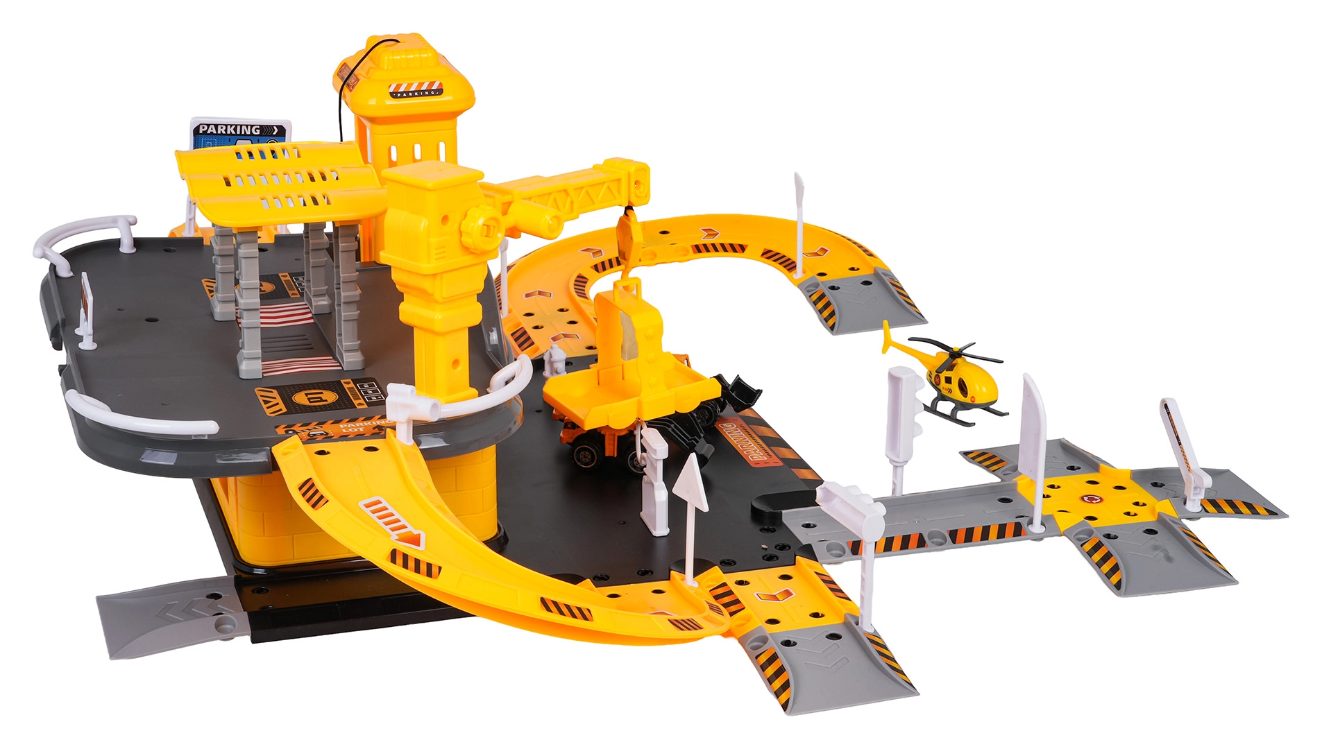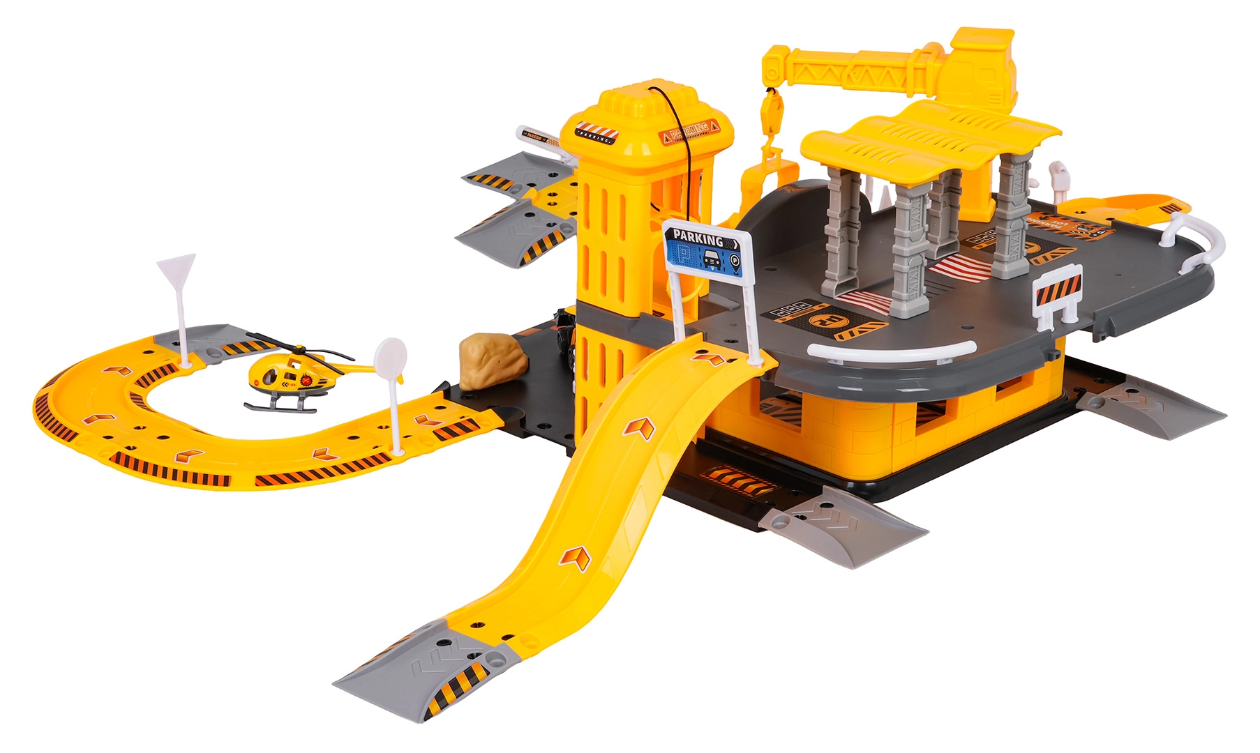 - Elementos del aparcamiento, 3 vehículos de construcción (martillo, excavadora, cargadora), helicóptero, señales de tráfico, semáforos, barreras, pegatinas, instrucciones