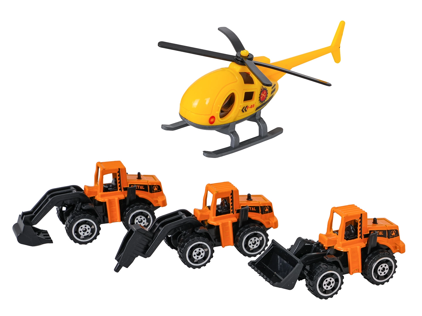 El paquete incluye tres máquinas metálicas con partes móviles y un helicóptero amarillo para intervenciones aéreas. Listo para misiones de acción en la obra.