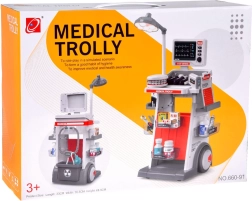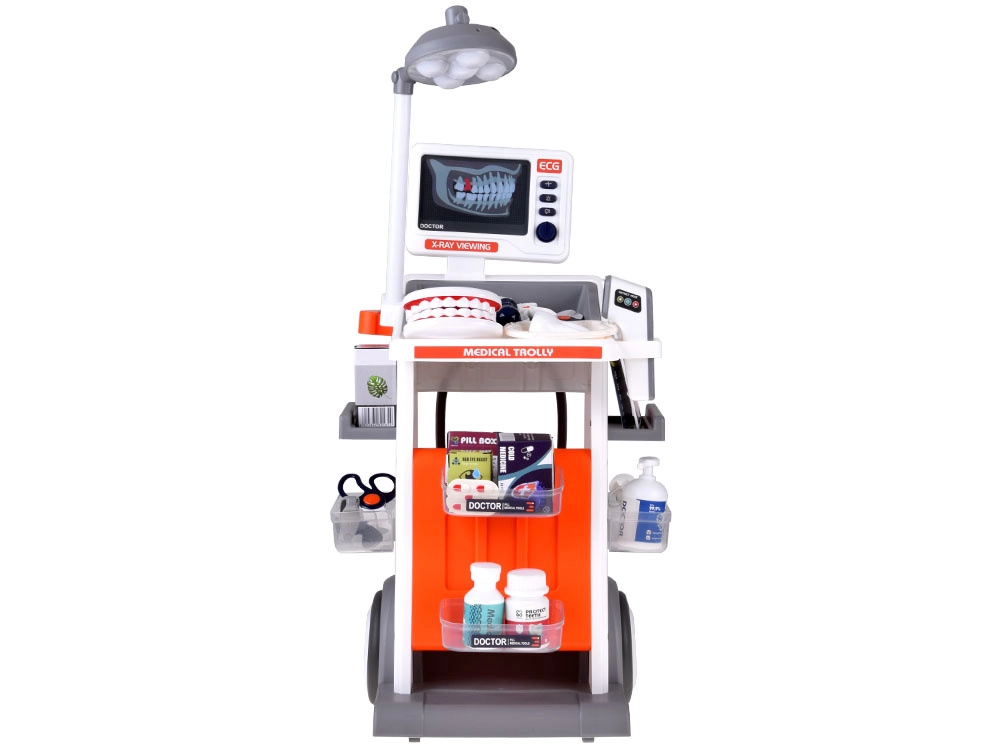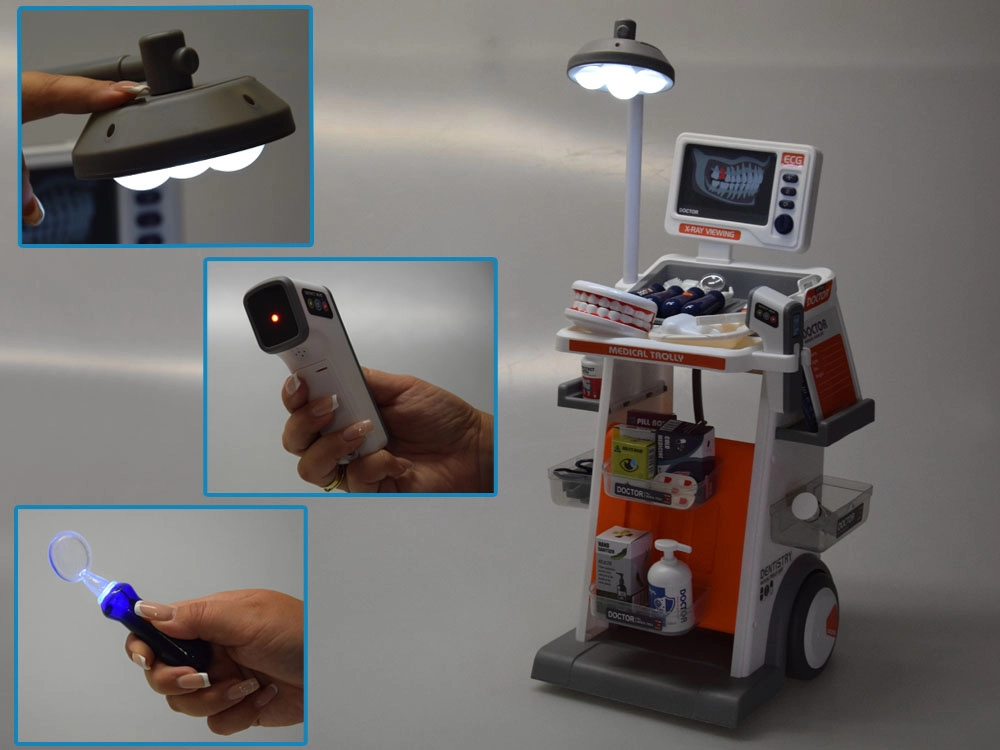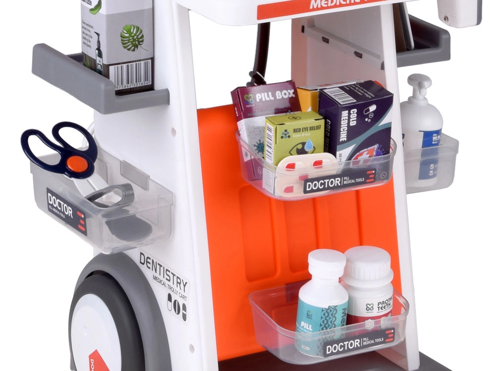 Estructura robusta con ruedas, múltiples estantes y bandejas para guardar de forma ordenada las herramientas y los “medicamentos”. Los niños pueden llevar el carrito fácilmente a cualquier lugar y tener todo a mano.