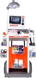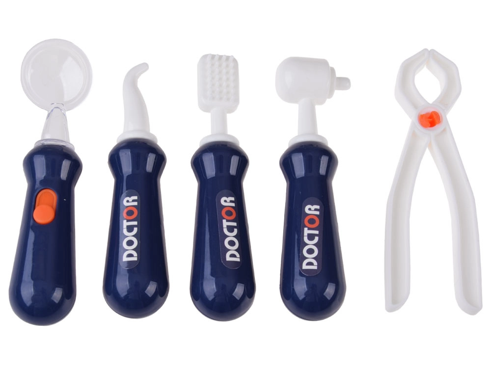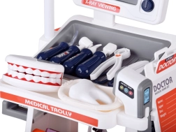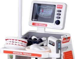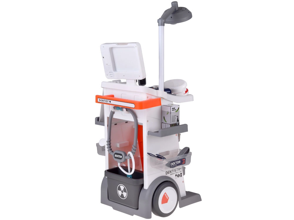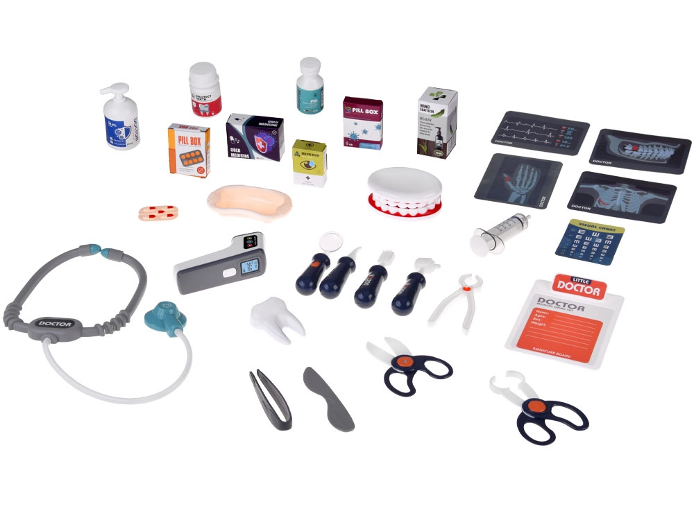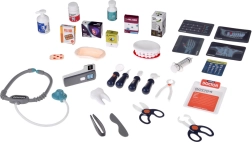 Incluye una amplia gama de accesorios: estetoscopio, termómetro, espejo dental con LED, pinzas, tijeras, cepillo, cápsulas, cajas de “medicamentos”, modelo de mandíbula abatible y “diente” independiente, tarjeta de ECG y tarjetas de rayos X. Gracias a su diseño móvil y estantes de almacenamiento, el set es ideal para el juego compartido y para mantener el orden.