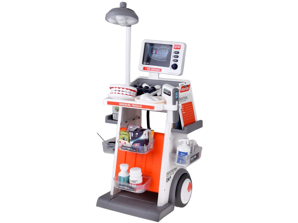Convierte la habitación infantil en una pequeña consulta. El carrito interactivo con monitor “Rayos X/ECG”, lámpara, compartimentos y ruedas giratorias ofrece un juego auténtico de médico y dentista. Los niños pueden escuchar el corazón, “radiografiar” al paciente, revisar los dientes en el modelo de mandíbula y probar de forma segura procedimientos habituales. Los efectos de luz y sonido realistas intensifican la experiencia y motivan a explorar.