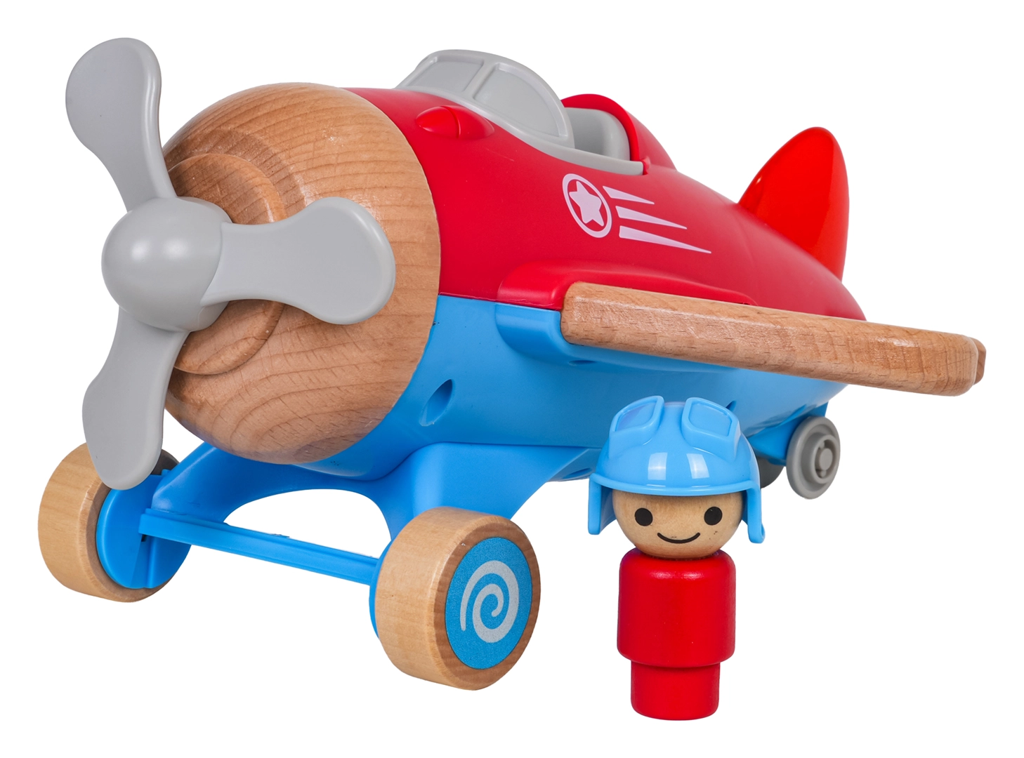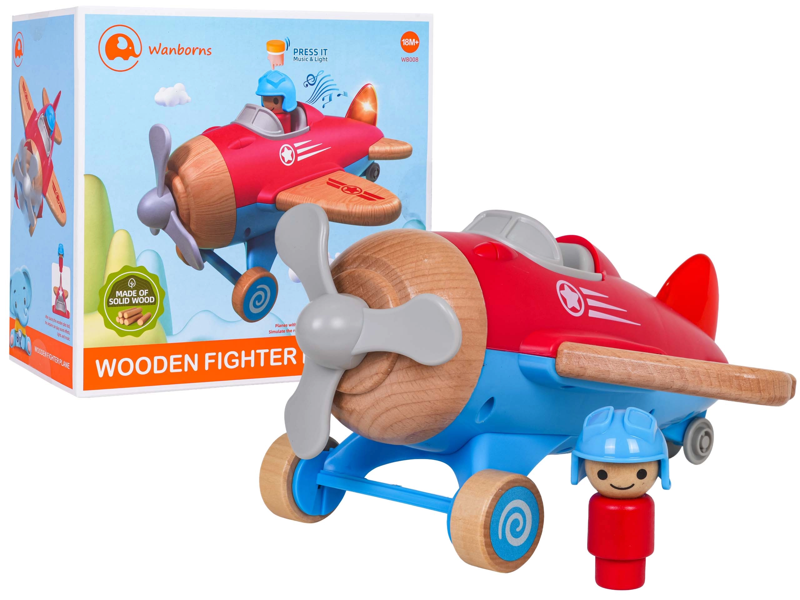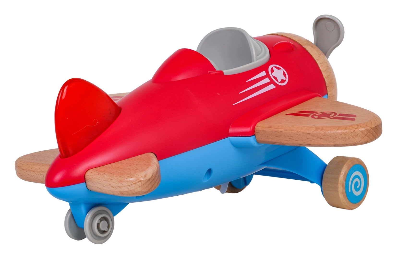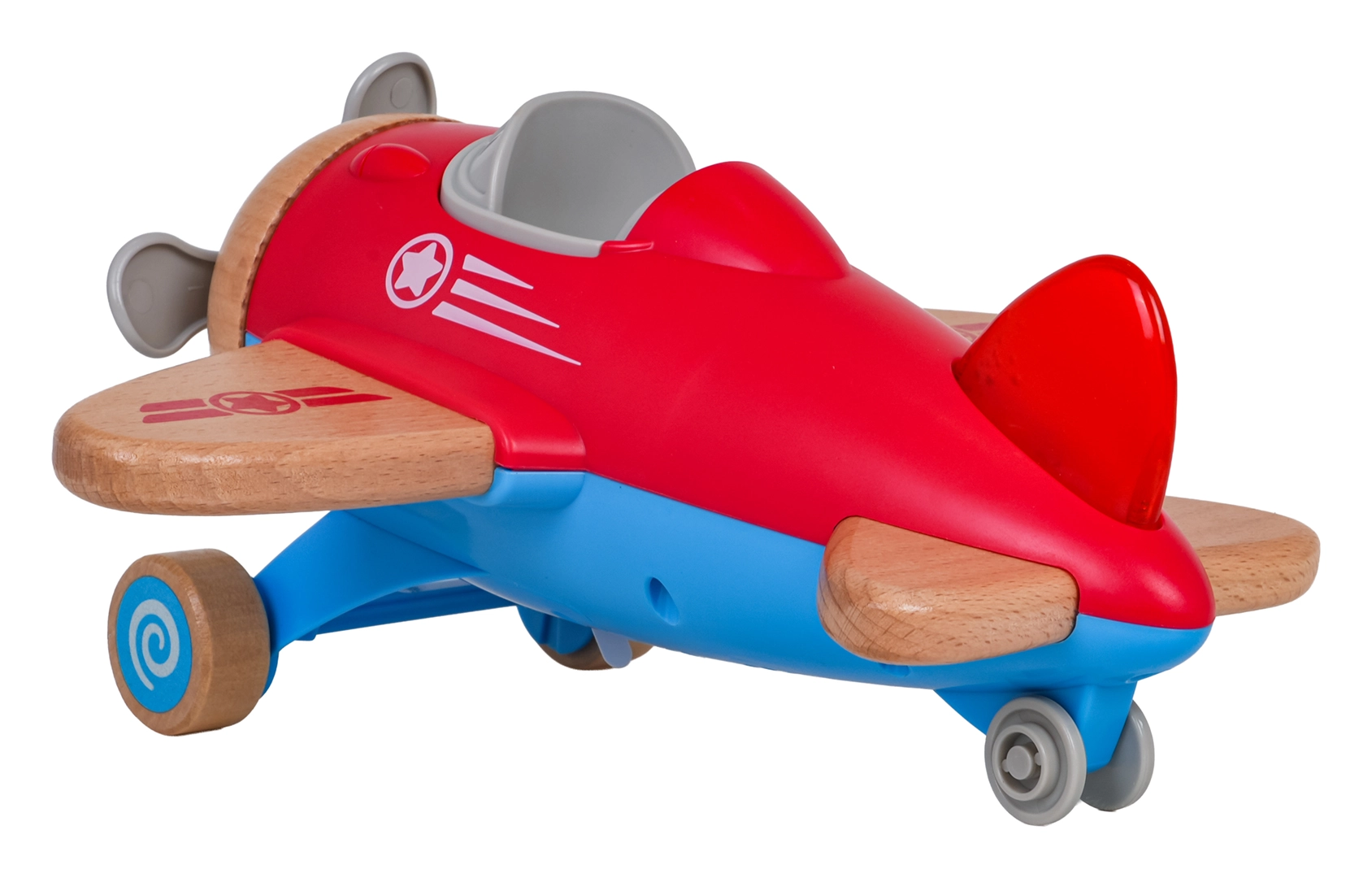 Colorido avión de madera para los más pequeños a partir de 18 meses, con efectos de luz y sonido, hélice giratoria y ruedas móviles. La combinación de madera y plástico de calidad garantiza durabilidad y un juego seguro sin bordes afilados. Al presionar la figura del piloto se reproducen melodías y sonidos de despegue y se ilumina el ala trasera.