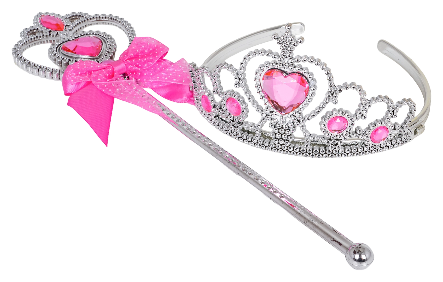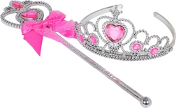 La corona plateada con piedrecitas rosas y la varita a juego aportan un brillo real al disfraz y estimulan la imaginación en los juegos de roles.