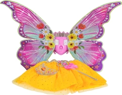 Encantador set de disfraces para niños a partir de 3 años que combina alas de mariposa de colores con efectos, un ligero tutú amarillo, una corona brillante y una varita mágica. Gracias a su cuidada elaboración y colores vibrantes, el niño se sentirá especial en cualquier baile, fiesta o en el juego diario de disfraces.