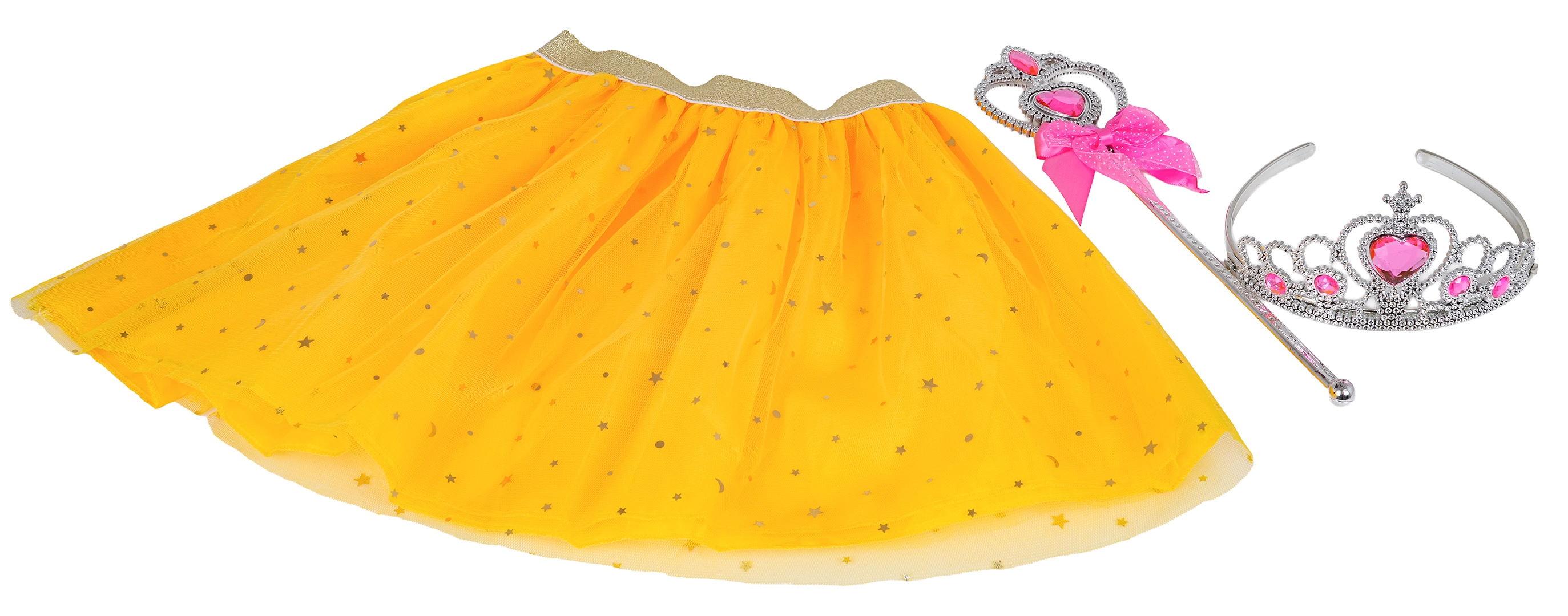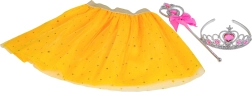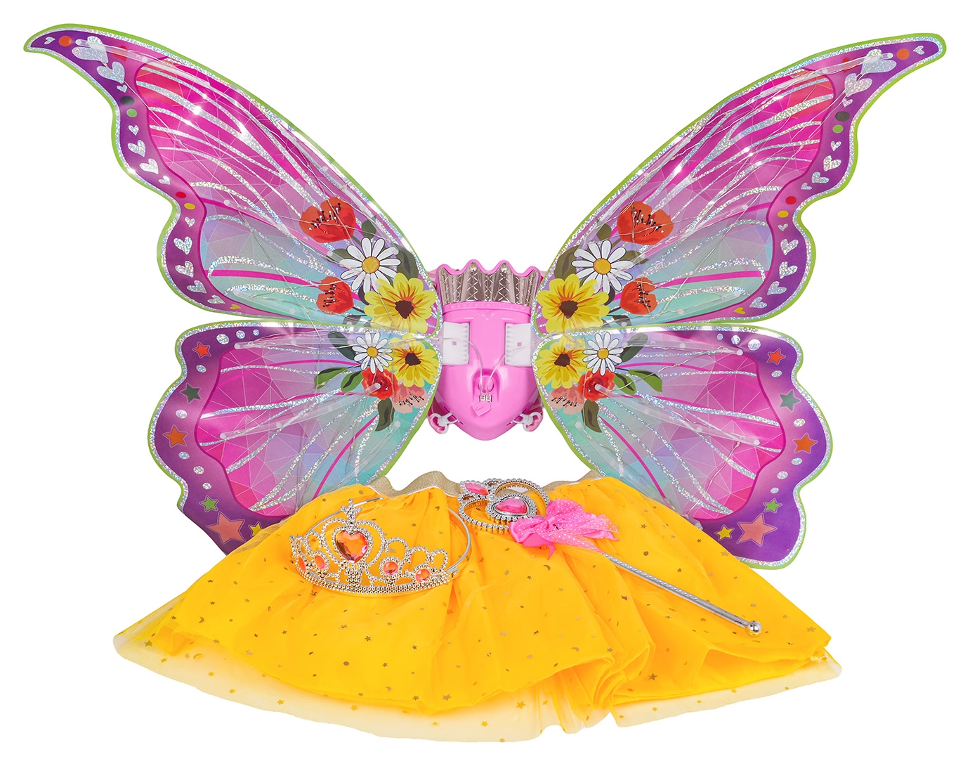 - alas de mariposa con luz y sonido, falda amarilla, varita mágica, corona