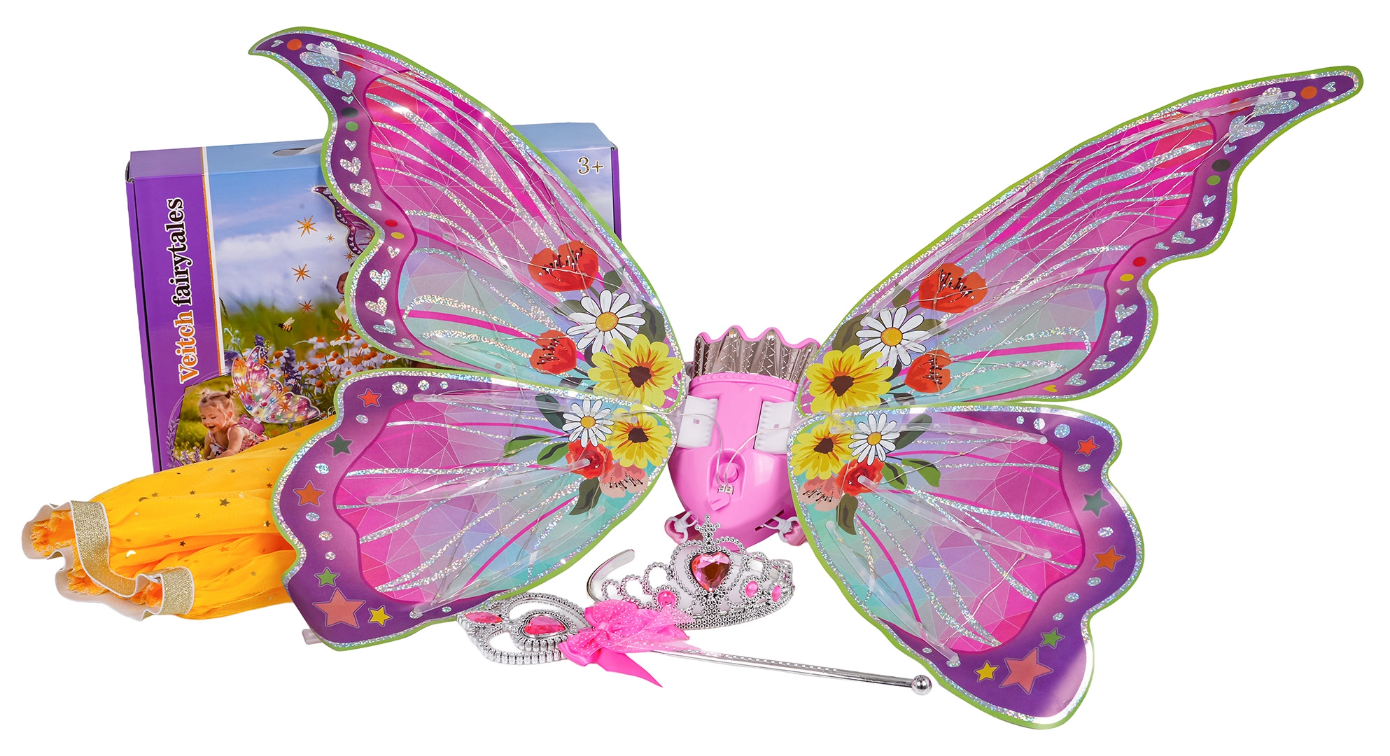 Convierte cada día en un cuento de hadas con este set mágico para pequeñas princesas. Incluye grandes alas de mariposa con luces y música, un tutú amarillo brillante, una corona plateada y una varita mágica. Gracias a los tirantes ajustables las alas se mantienen bien sujetas, los efectos de luz y sonido encantan, y la falda ligera con estrellitas brillantes garantiza un uso cómodo. Ideal para carnavales, actuaciones y juegos de fantasía en casa. Las alas ofrecen varios modos de aleteo e iluminación y funcionan con 4× AA 1,5 V (no incluidas).