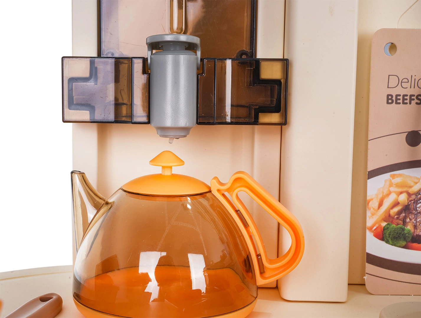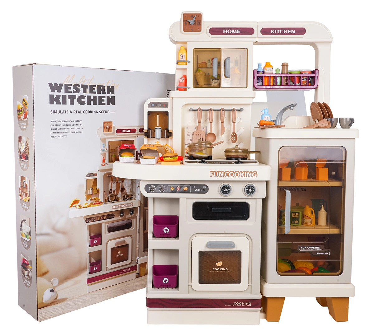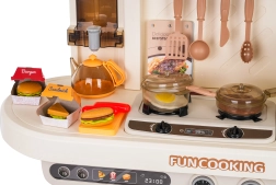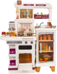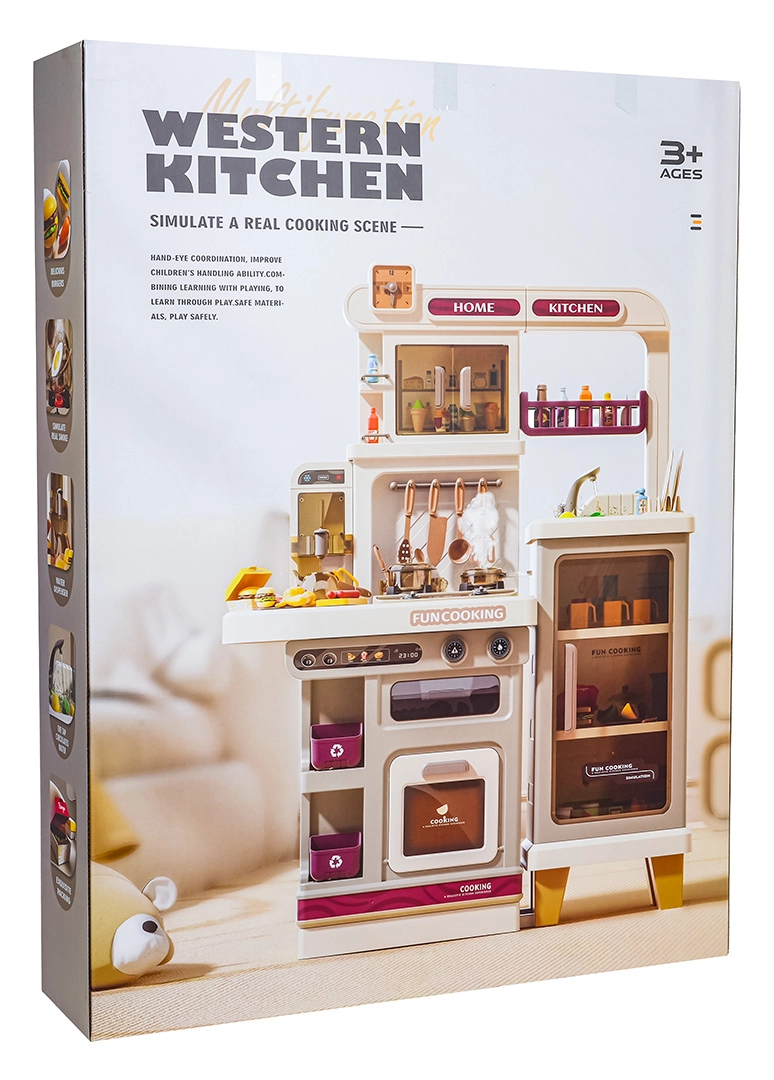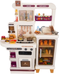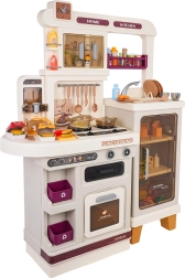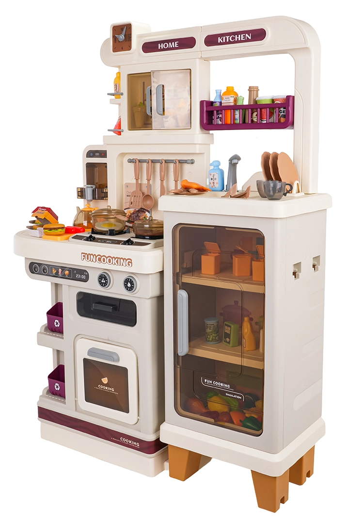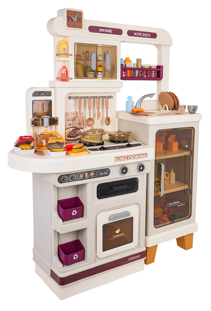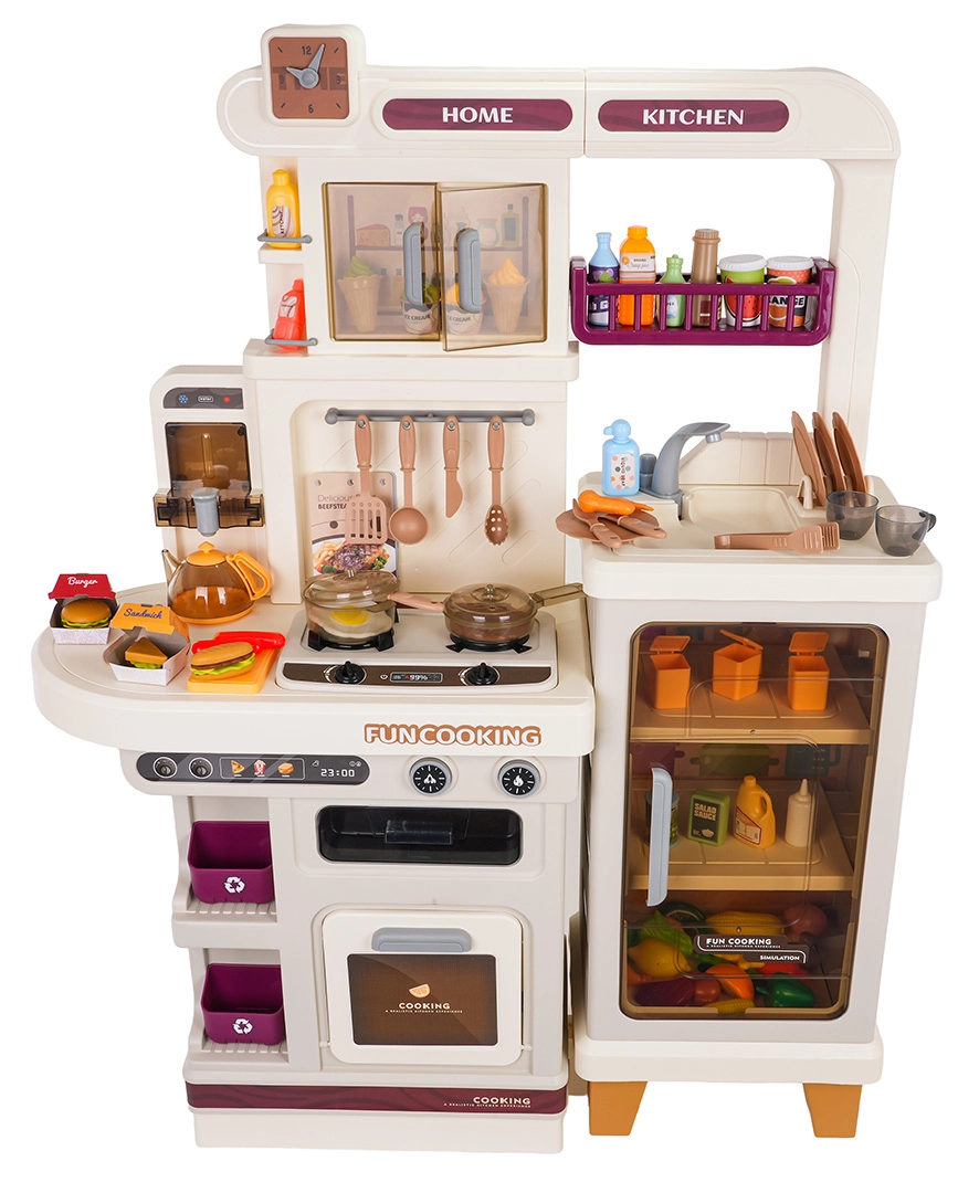 Esta cocina multifuncional en elegante color beige está fabricada con plástico de alta calidad y duradero, y encantará a cualquier niño con funciones realistas. Los fogones iluminados emiten sonidos de cocción y fritura, de uno de los quemadores se eleva suave vapor y del grifo funcional fluye agua. El horno y la nevera con puertas abatibles, junto con estantes y ganchos, mantienen todos los accesorios bien organizados en su sitio.
